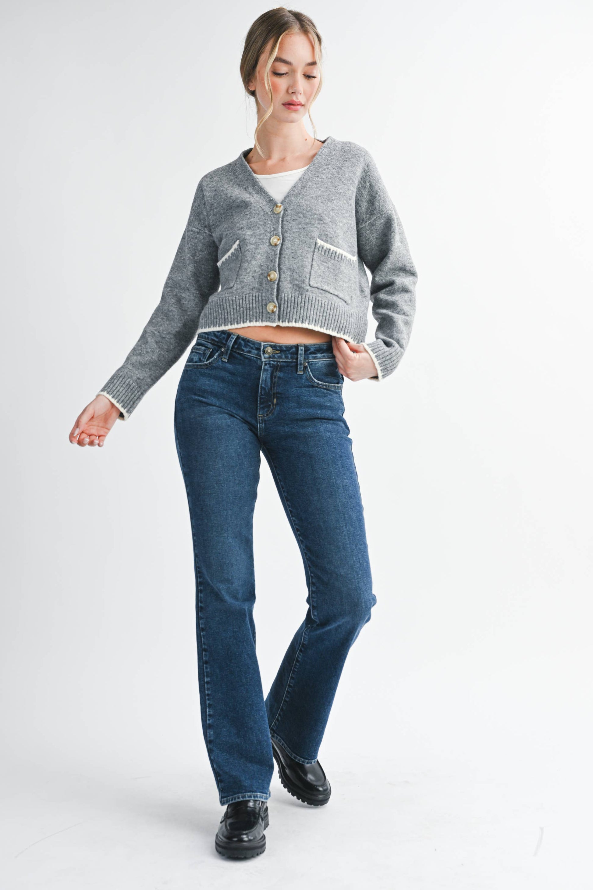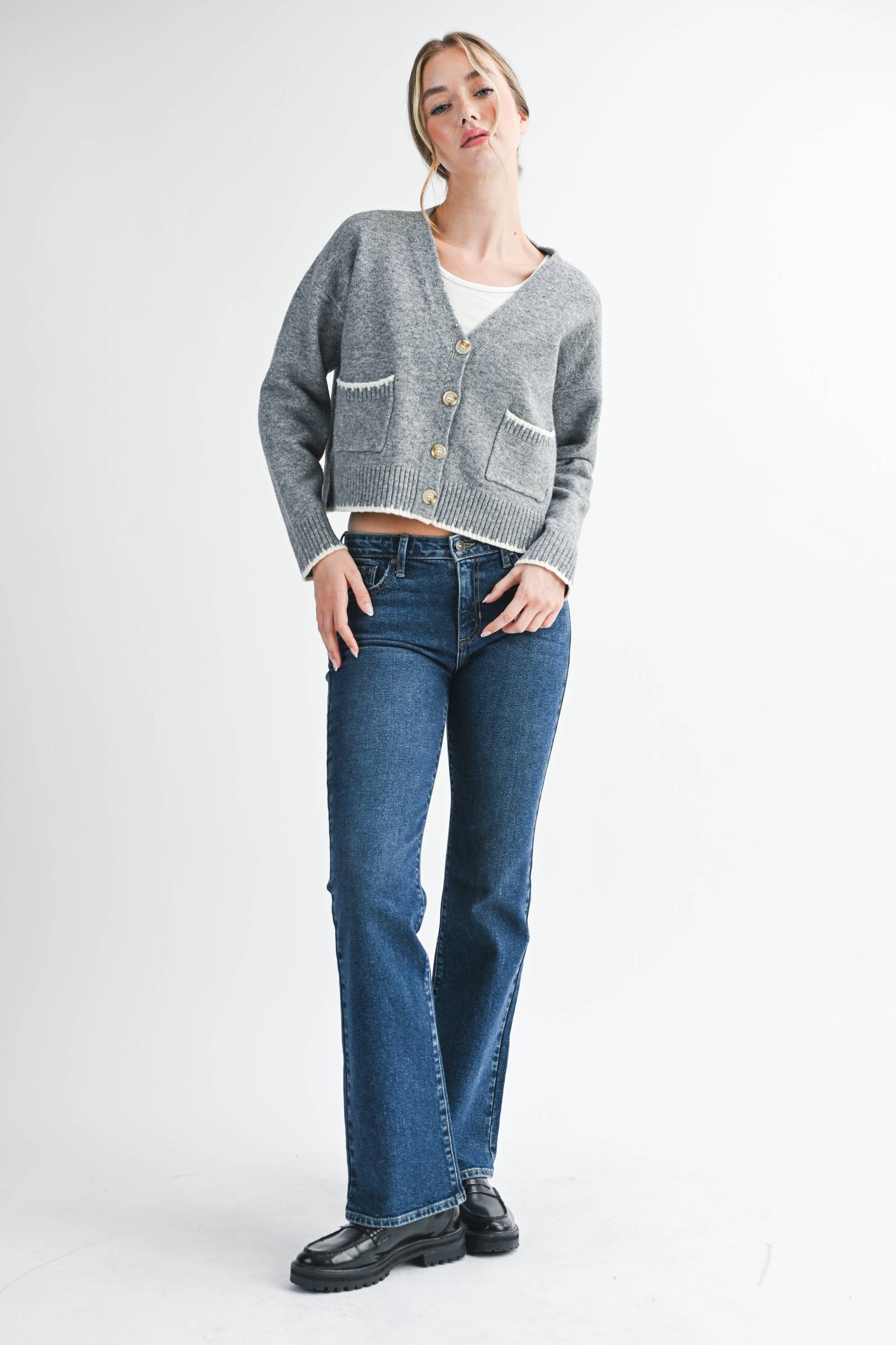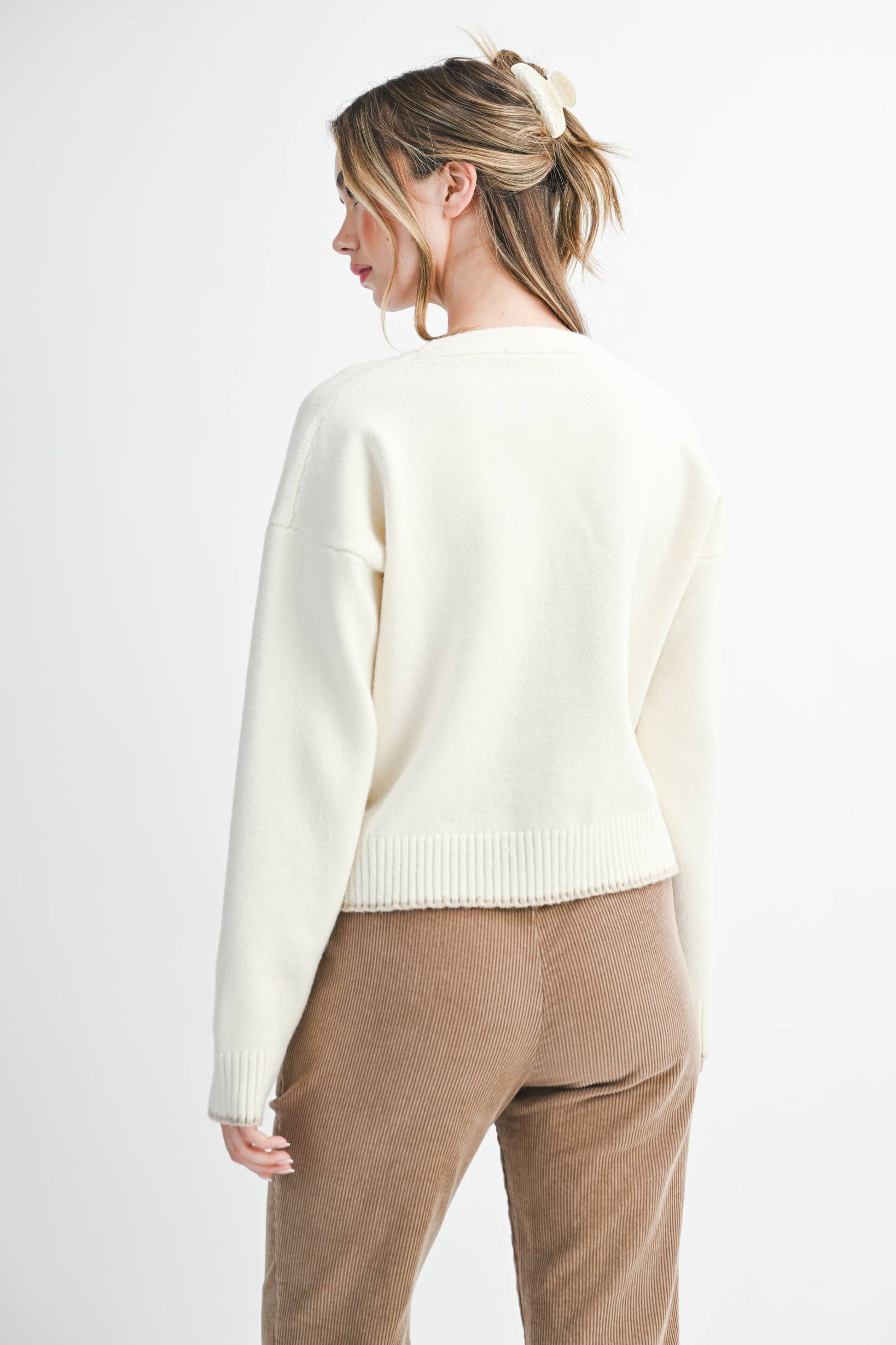 Soft, warm, and endlessly wearable, this ivory cropped cardigan features standout contrast stitching and oversized buttons for added charm. Crafted from a brushed wool blend, it’s equal parts cozy and cute.