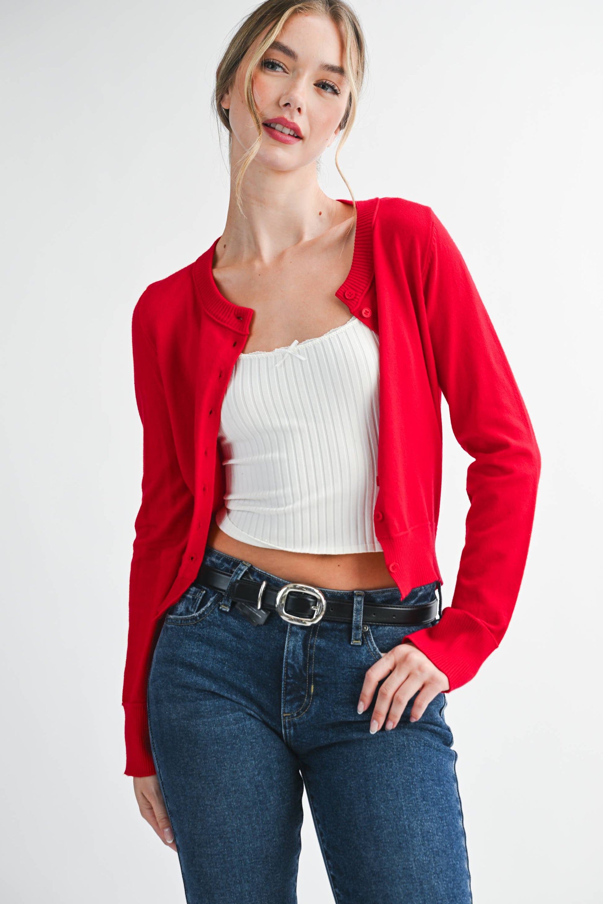 This easy knit cardigan features a classic button-up front with ribbed trim and a slightly cropped silhouette that flatters any look. Lightweight yet cozy, it's your new go-to layer for everything from crisp coffee runs to lounging at home. Wear it solo or over your favorite tee for effortless charm.