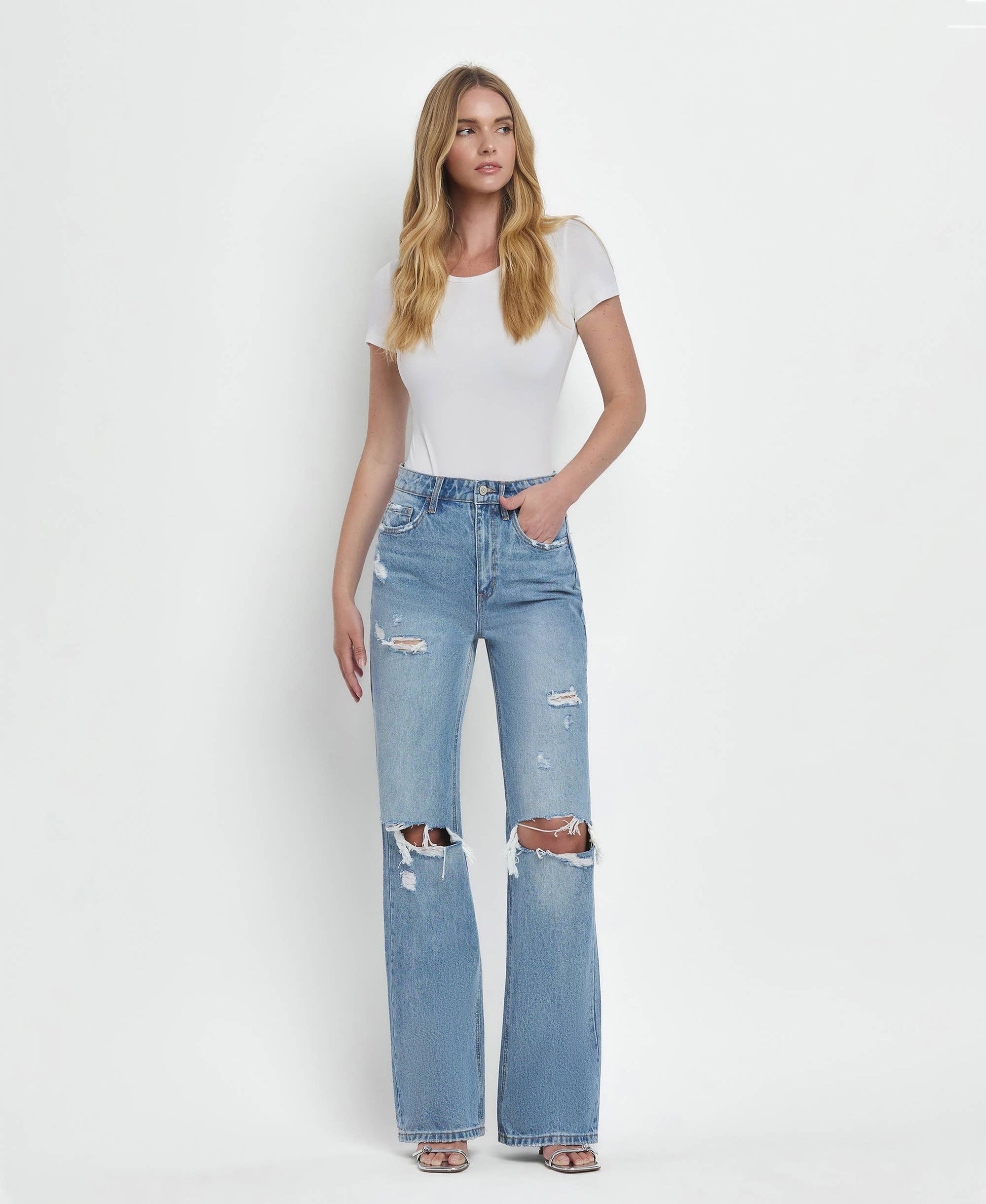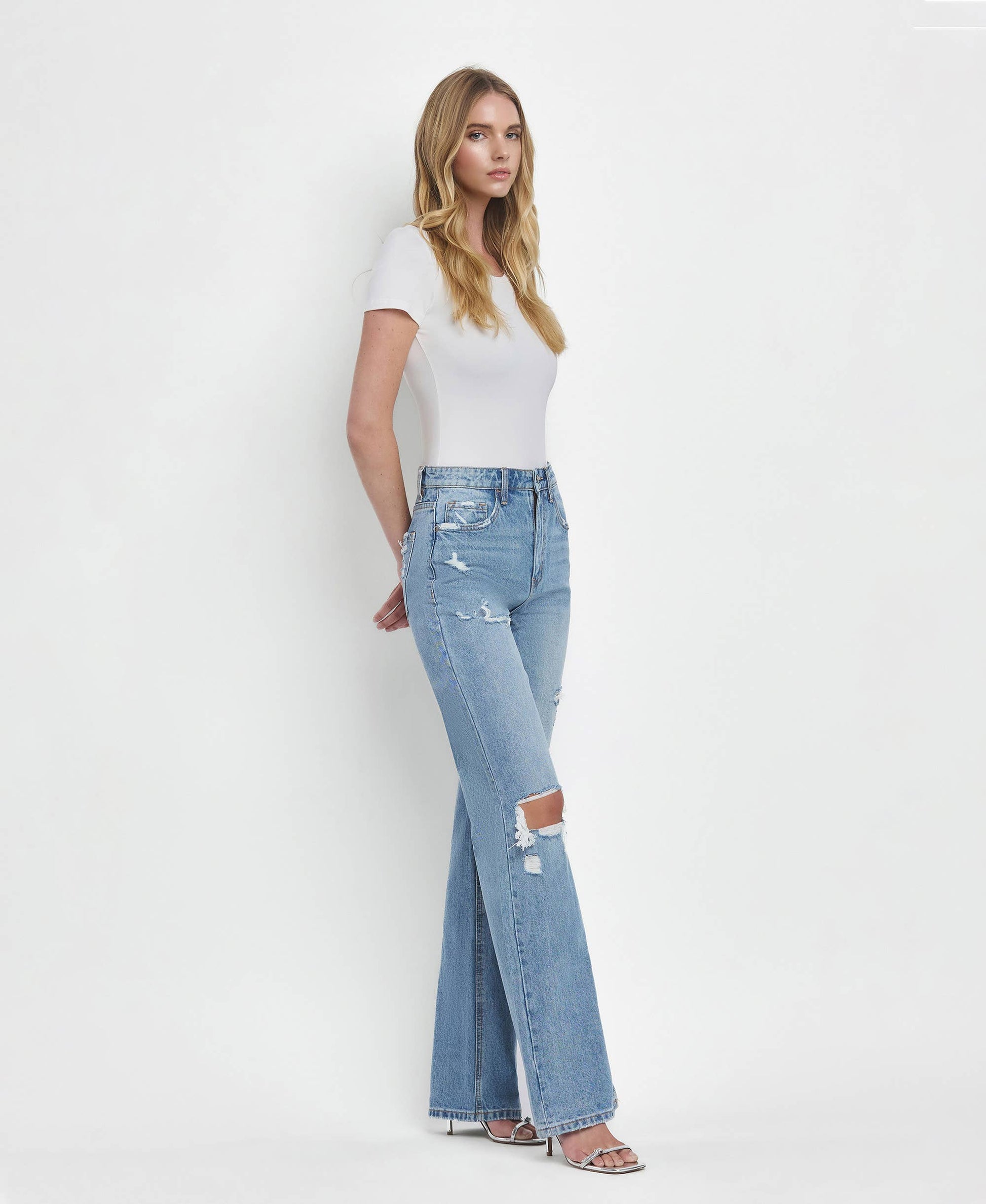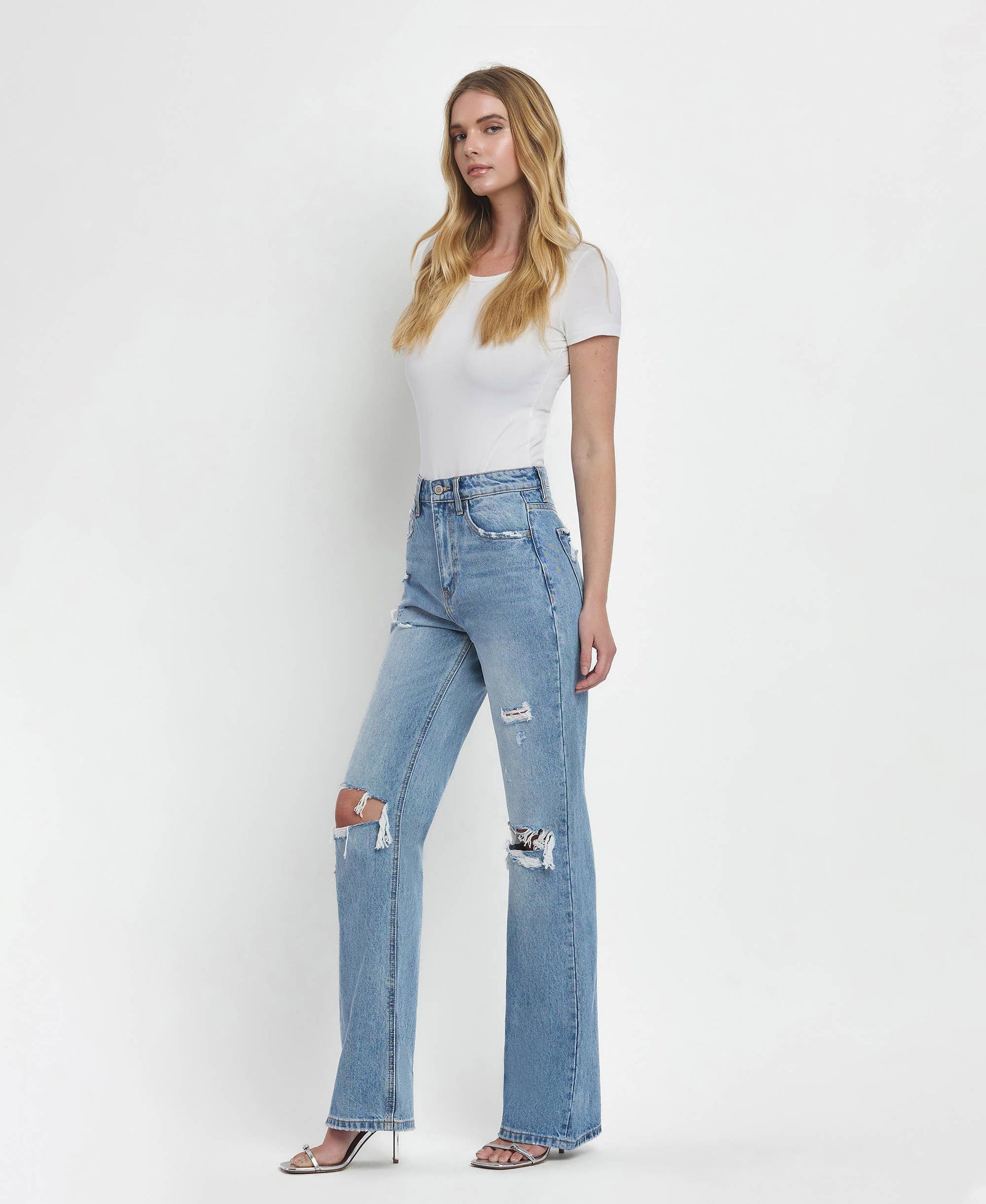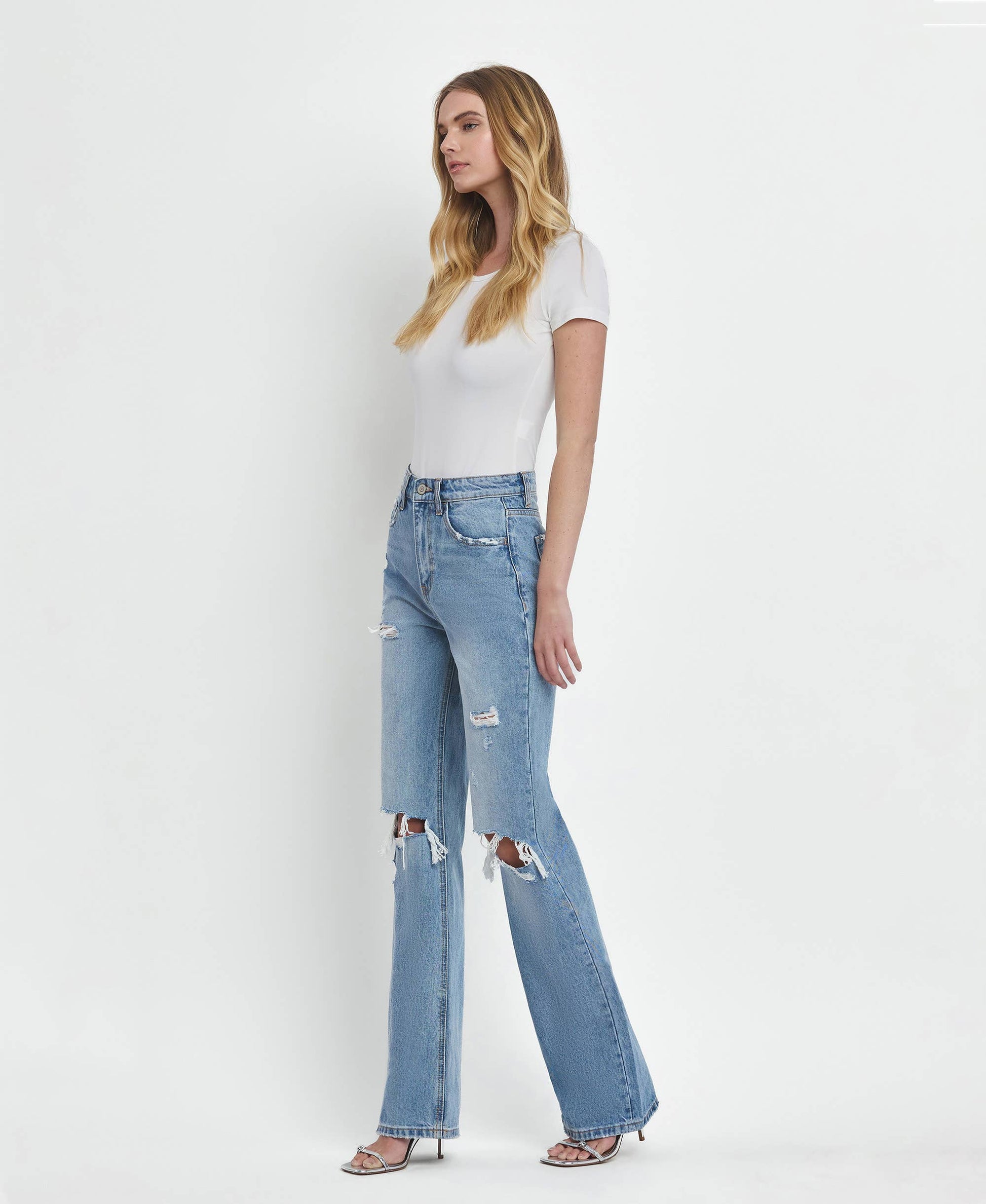 NON STRETCH DENIM, SUPER HIGH RISE WAIST, 90'S VINTAGE STYLE, 5 POCKETS, DISTRESSED DETAIL, FINISHED HEM, FULL LENGTH, MEDIUM LIGHT WASH, FLARE JEANS