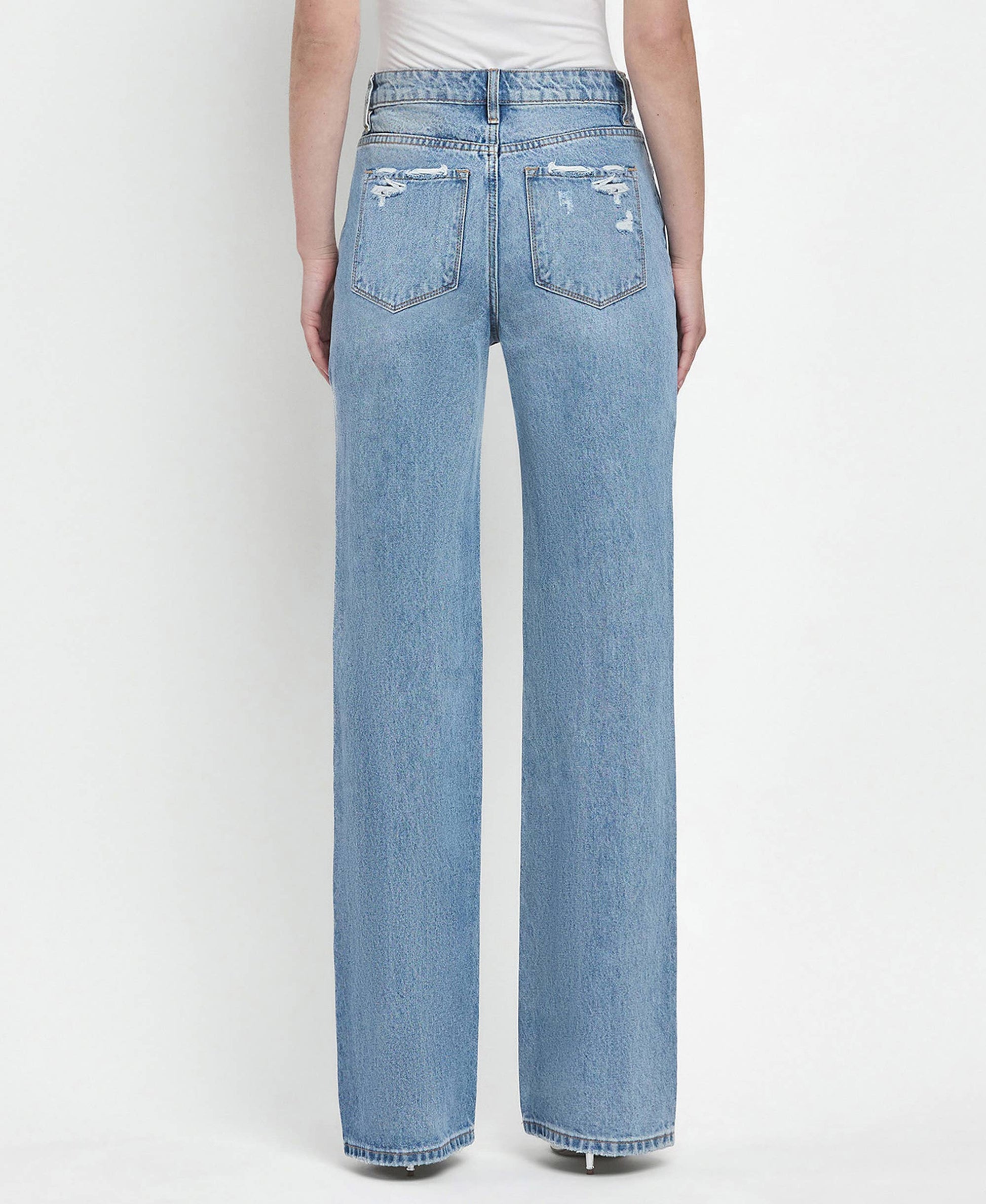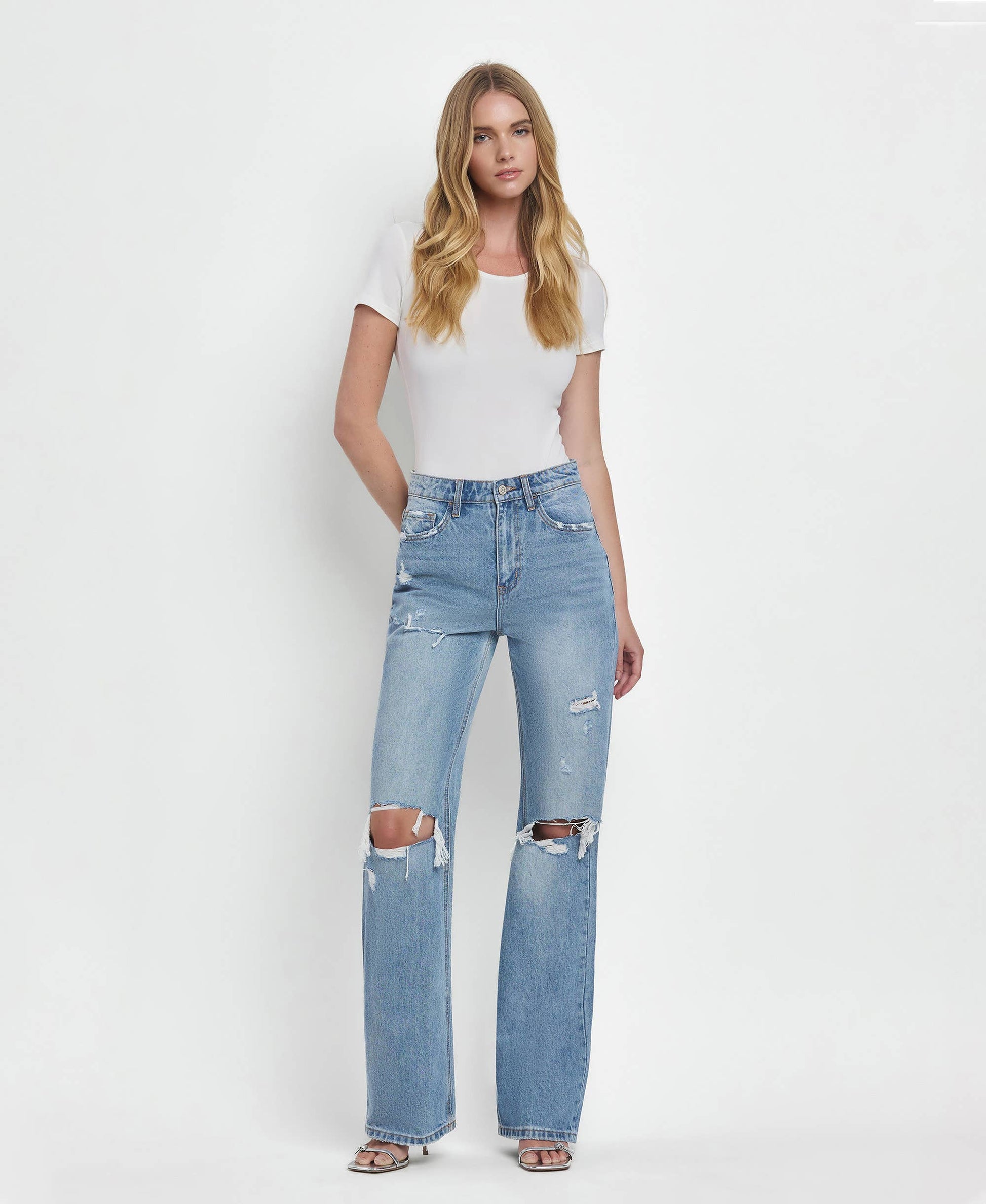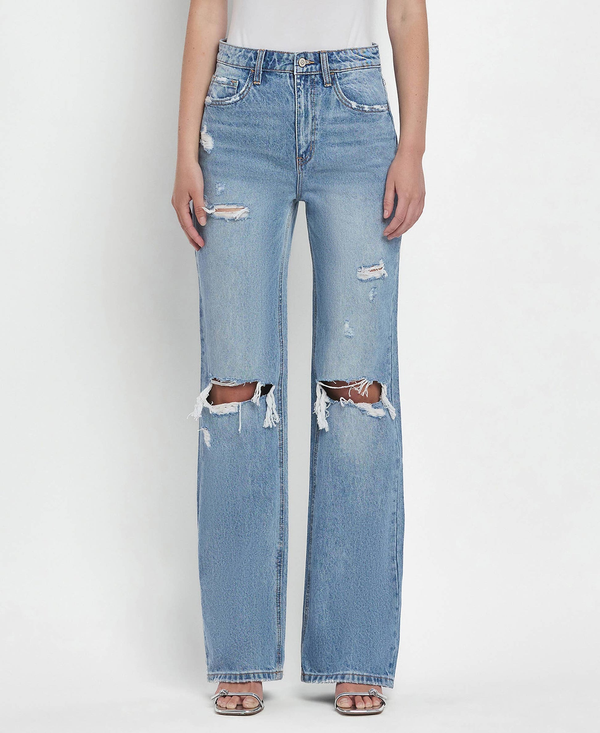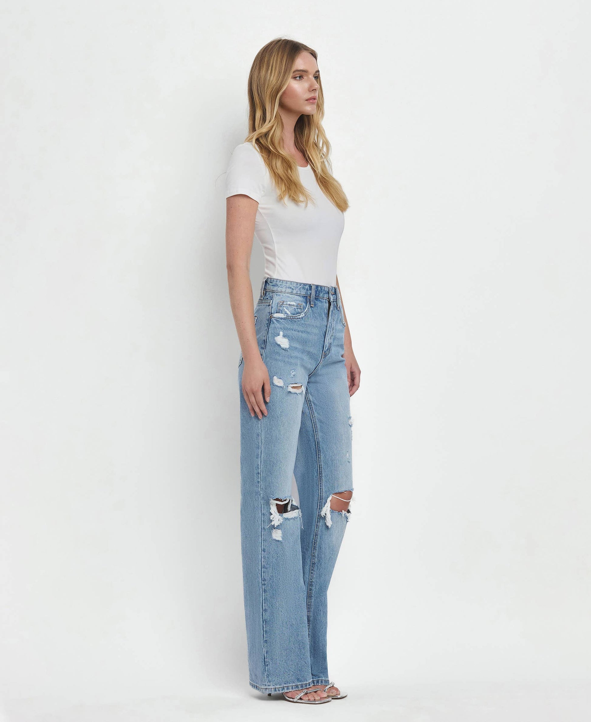 NON STRETCH DENIM, SUPER HIGH RISE WAIST, 90'S VINTAGE STYLE, 5 POCKETS, DISTRESSED DETAIL, FINISHED HEM, FULL LENGTH, MEDIUM LIGHT WASH, FLARE JEANS