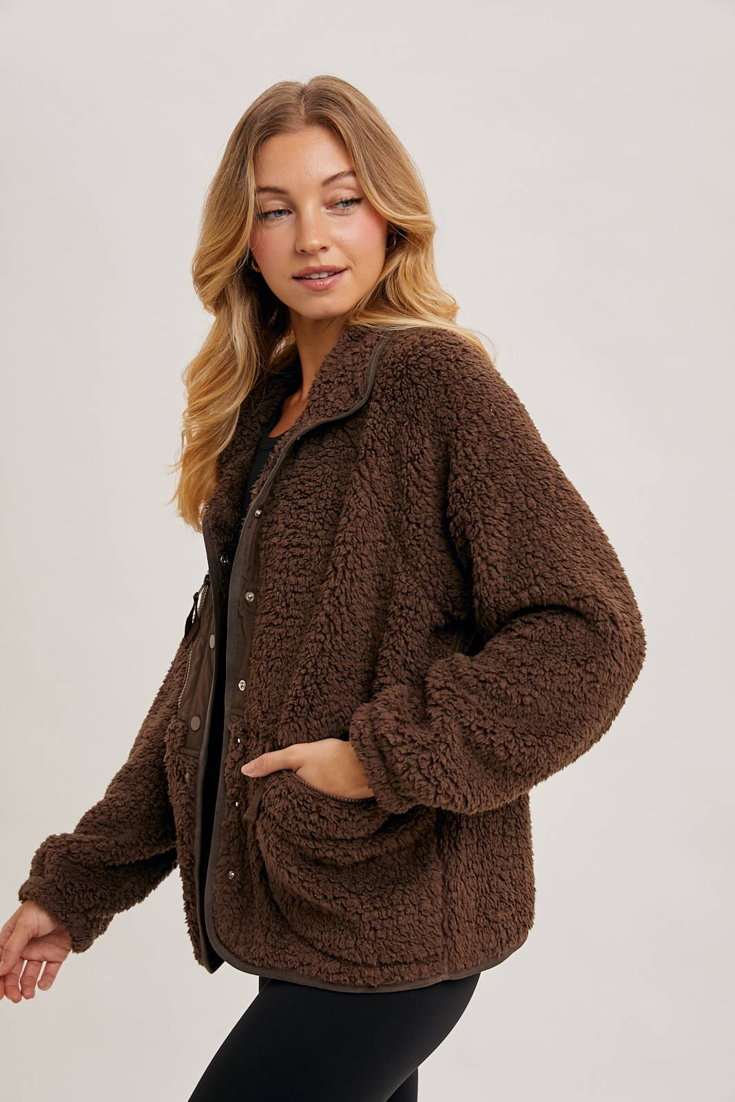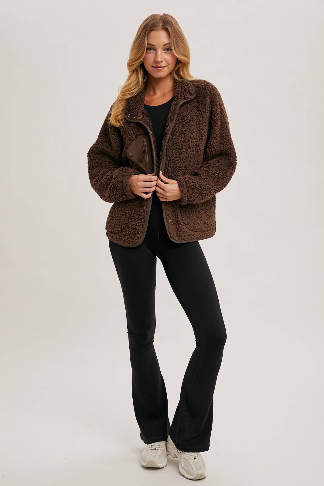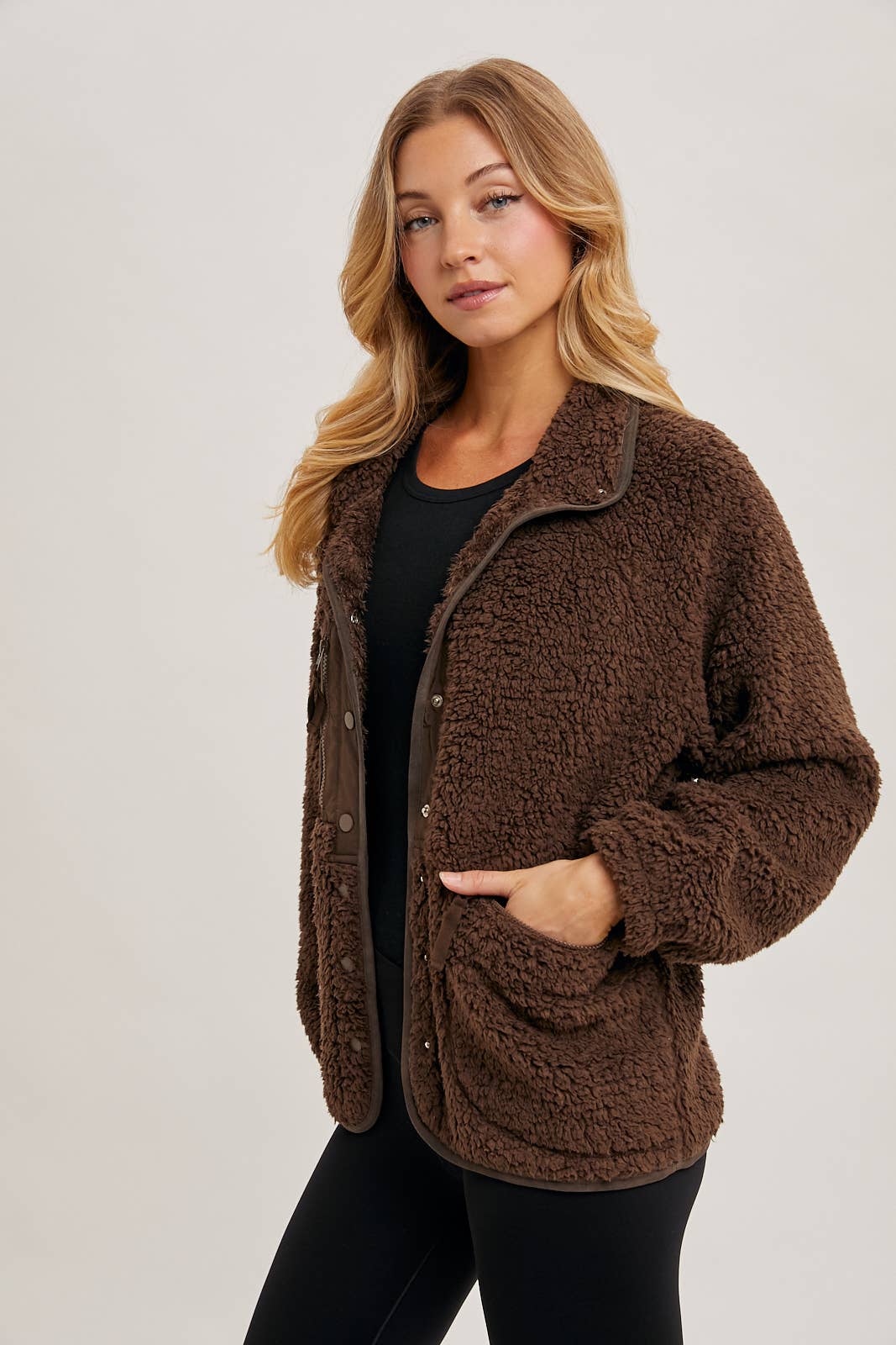 The button-down fleece sherpa jacket is designed for warmth and comfort, making it perfect for cooler weather. Featuring a soft, plush sherpa lining, this jacket provides excellent insulation while maintaining a stylish look. The outer layer is typically made of durable fleece, adding texture and structure to the design. With a classic button-down front, it offers a versatile layering option that can be worn open or closed. The jacket often includes practical details like side pockets and a relaxed fit, making it both functional and cozy for everyday wear.