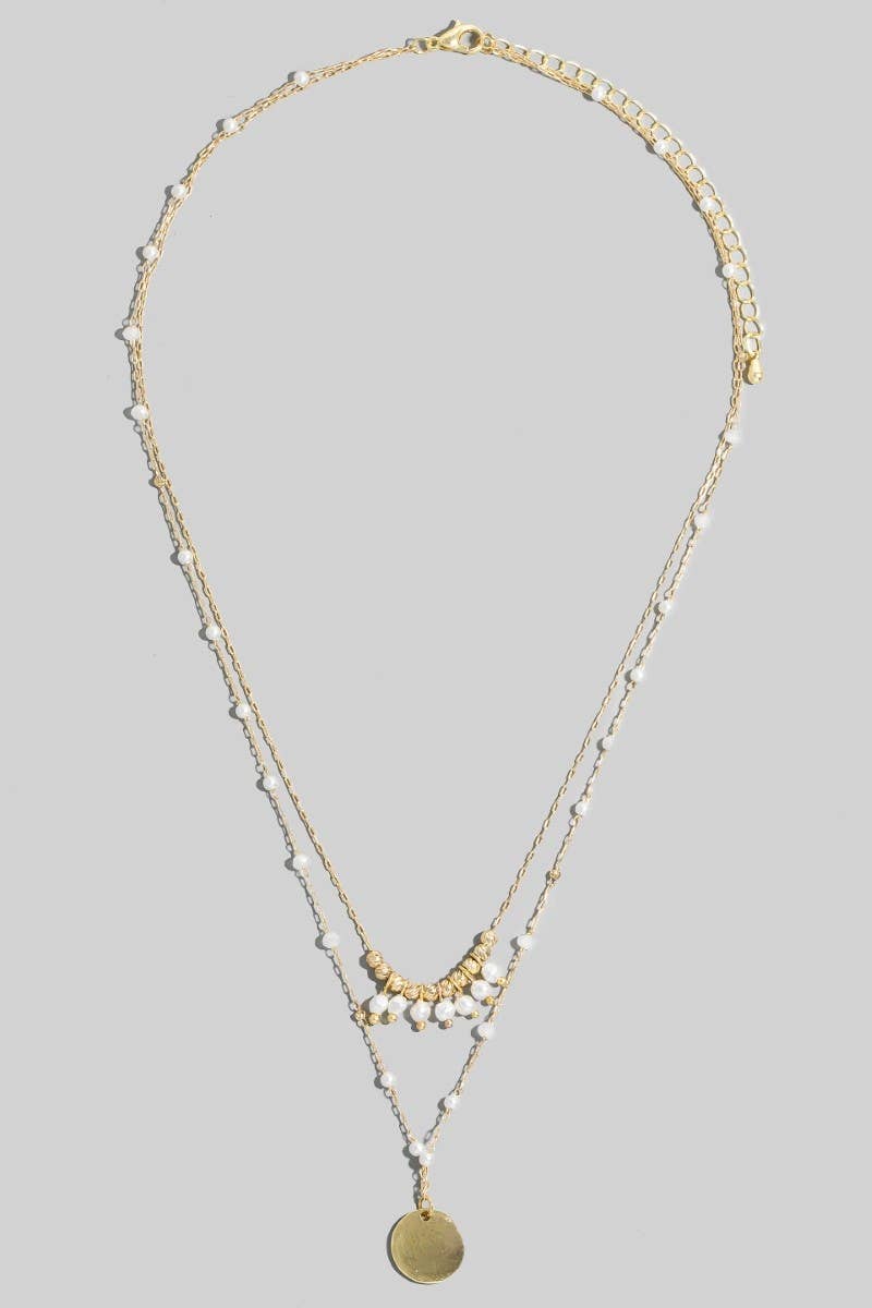 This layered necklace brings a luxurious coin pendant pearl station beads style. Celebrate individuality with this layered necklace that effortlessly expresses your unique sense of style.