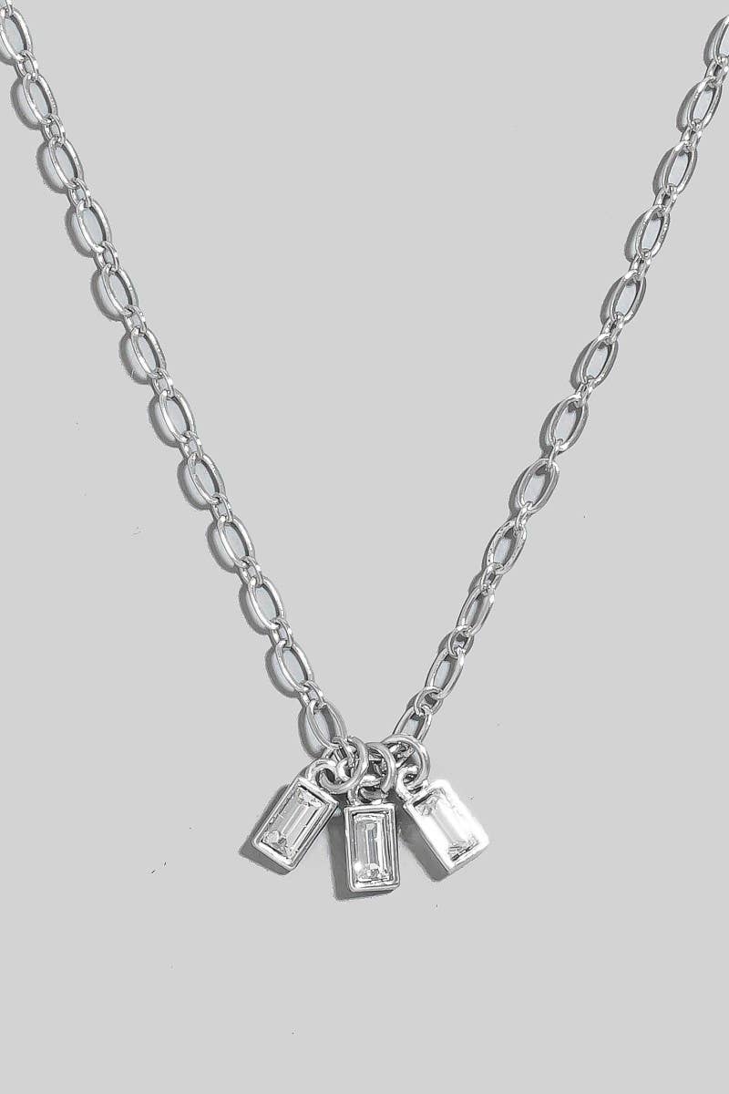 This chain necklace adds a modern faceted glass baguette charms style. Unveil a new dimension of sophistication as this chain necklace effortlessly enhances the elegance of your ensemble.