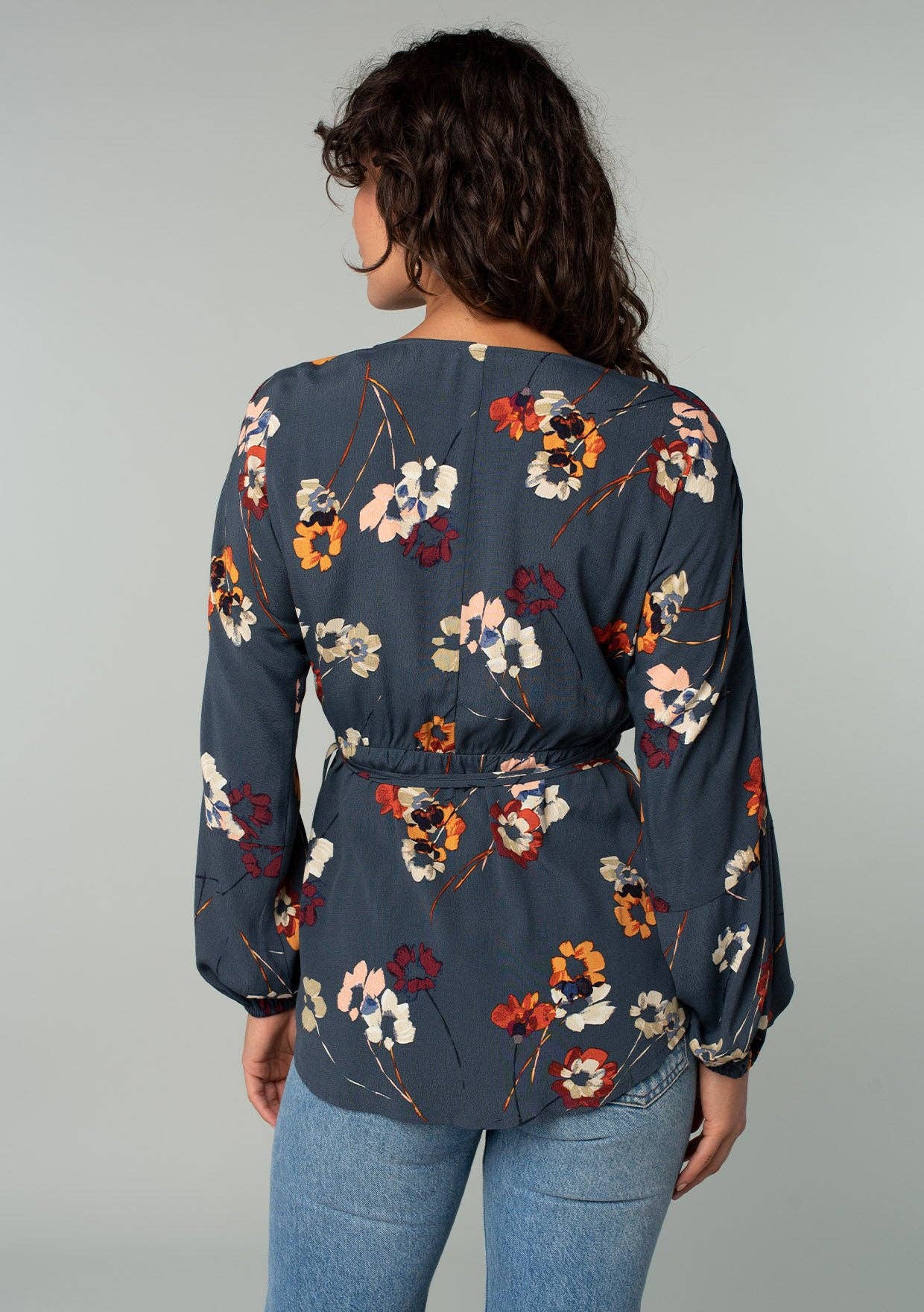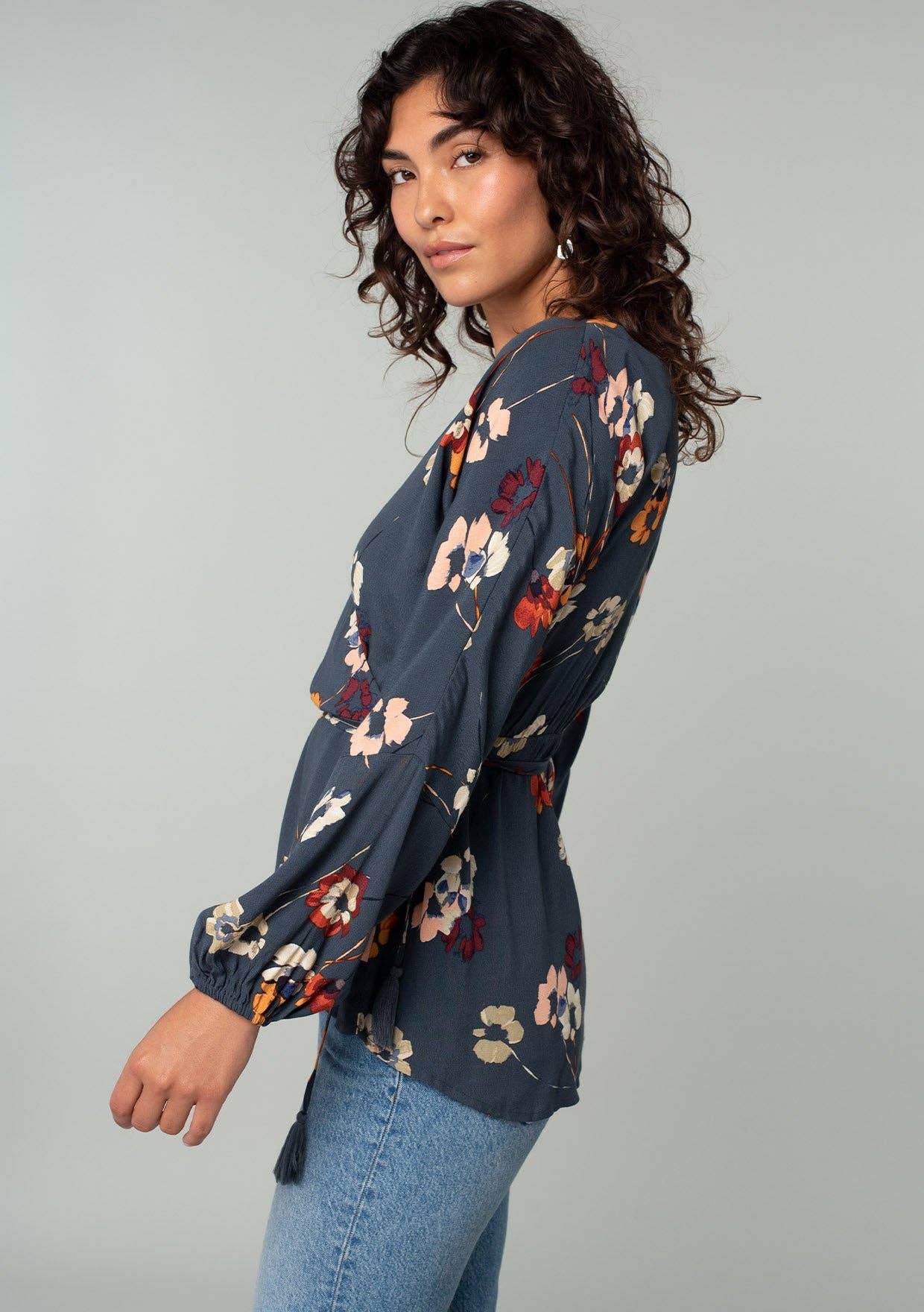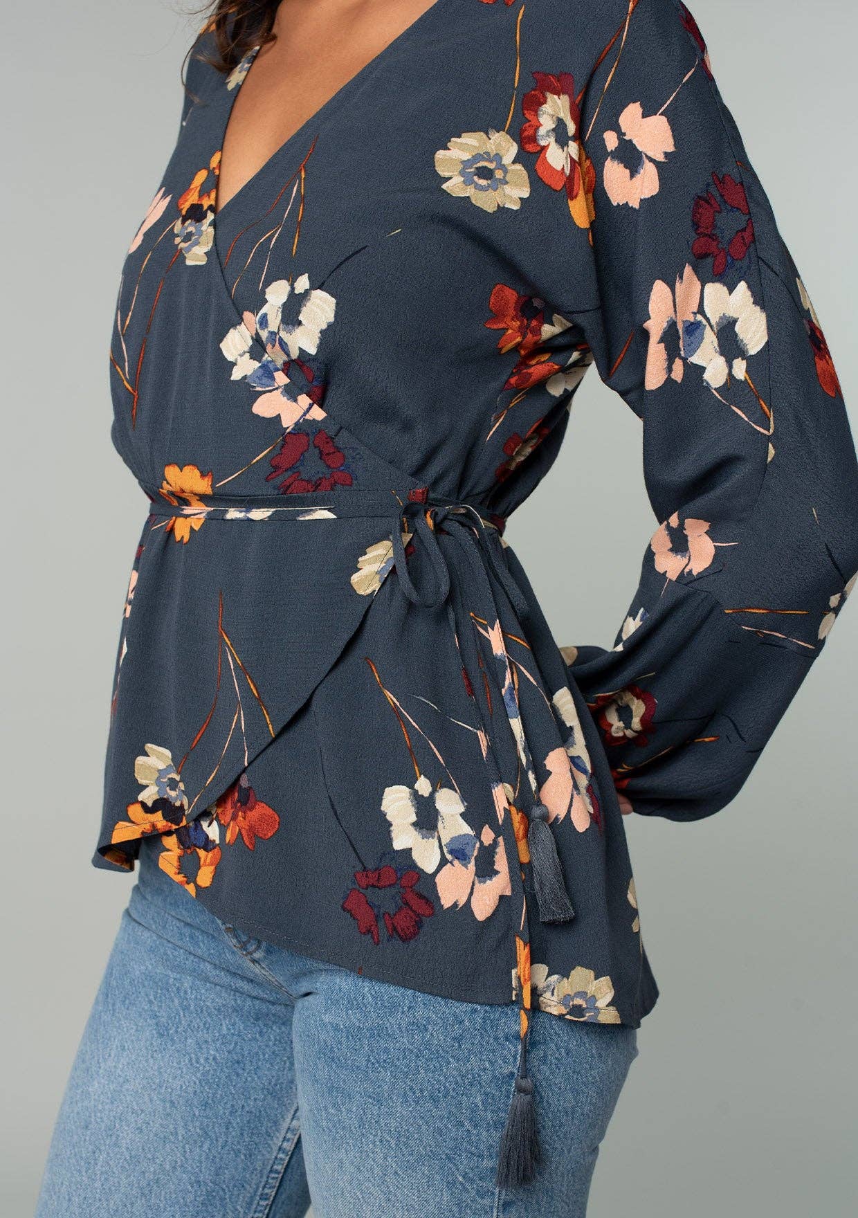 Floral wrap top that features self-adjusting tassel ties, long sleeves, and elastic cuffs. The perfect vacation top for the Summer.