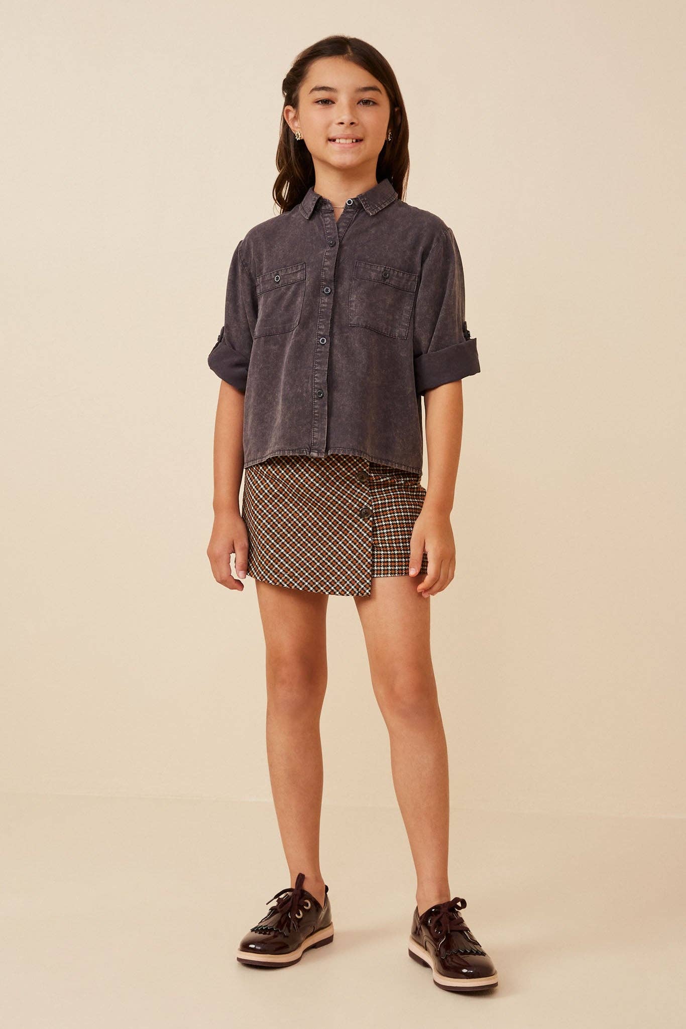 Product Details: Our Garment Dyed Tencel Button Up Shirt Features: * Tencel Woven Fabric * Button Up * Long Sleeves with Roll Tabs * Due to the nature of the wash and garment dye process, each piece is unique and no two pieces are exactly alike. Measurements: Size Length Chest Small 18" 17" Medium 18.5" 18" Large 19" 19" X-Large 19.5" 20" The measurements in the chart above reflect the garment laying flat. For body measurements please visit our Size Guide. Model Stats: * Height: 4'4" * Wearing Size: S Material & Care: * Hand Wash Cold * Hang Dry