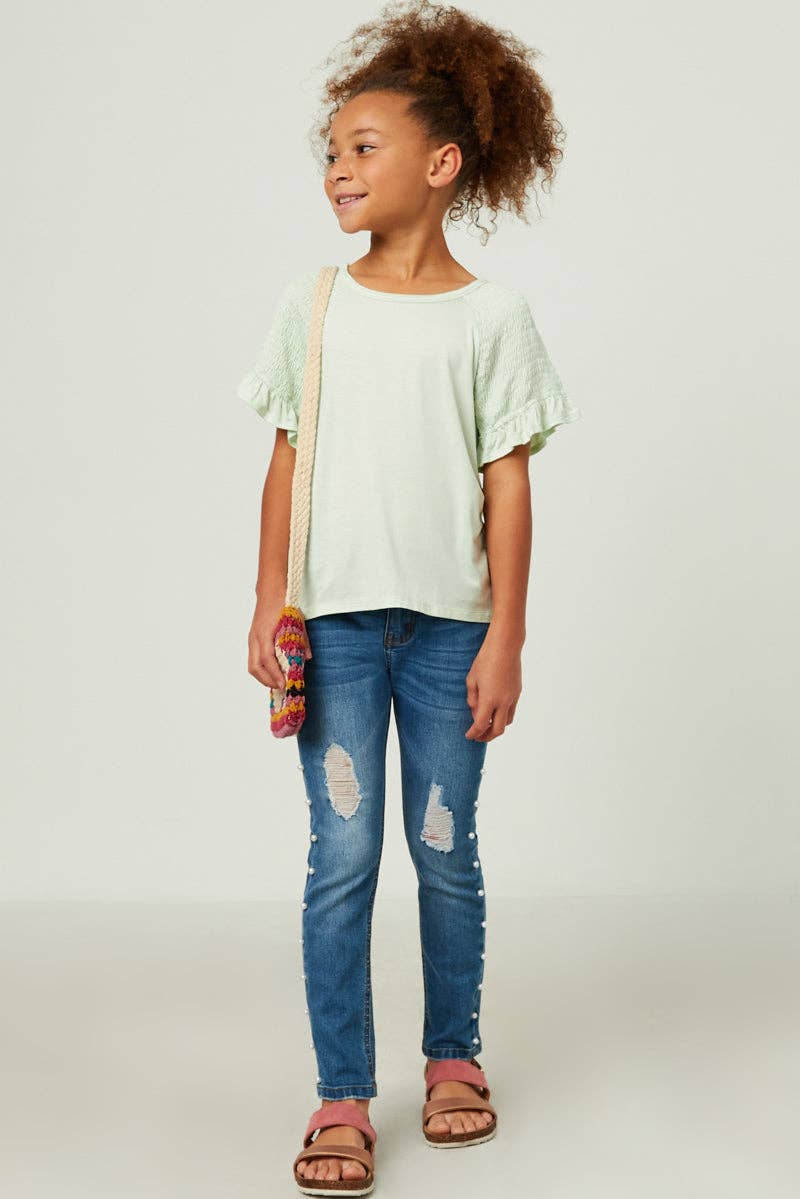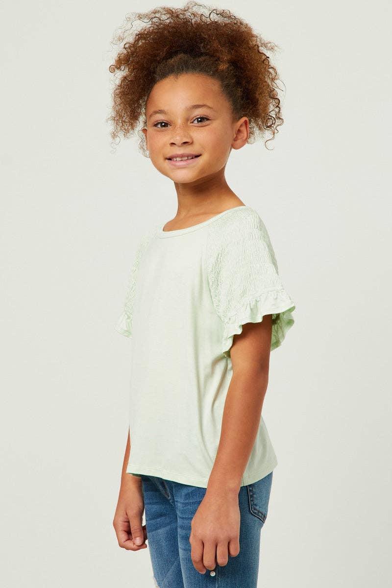 Our Smocked Shoulder Ruffle Sleeve Top Features: * Knit Fabric * Round Cut Neckline * Smocked Shoulder Detail Measurements: Size Length Chest Small 18" 14.5" Medium 19" 15.5" Large 20.5" 16.5" X-Large 22.5" 18" The measurements in the chart above reflect the garment laying flat. For body measurements please visit our Size Guide. Model Stats: * Height: 4'1" * Wearing Size: S Material & Care: * 93% Rayon 7% Spandex * Hand Wash Cold * Hang Dry