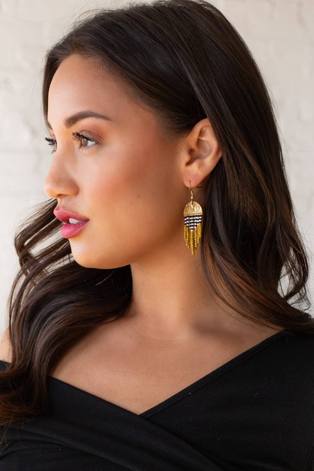 Mustard, black & white beaded fringe earrings Silver detail 2" length Lead and nickel free