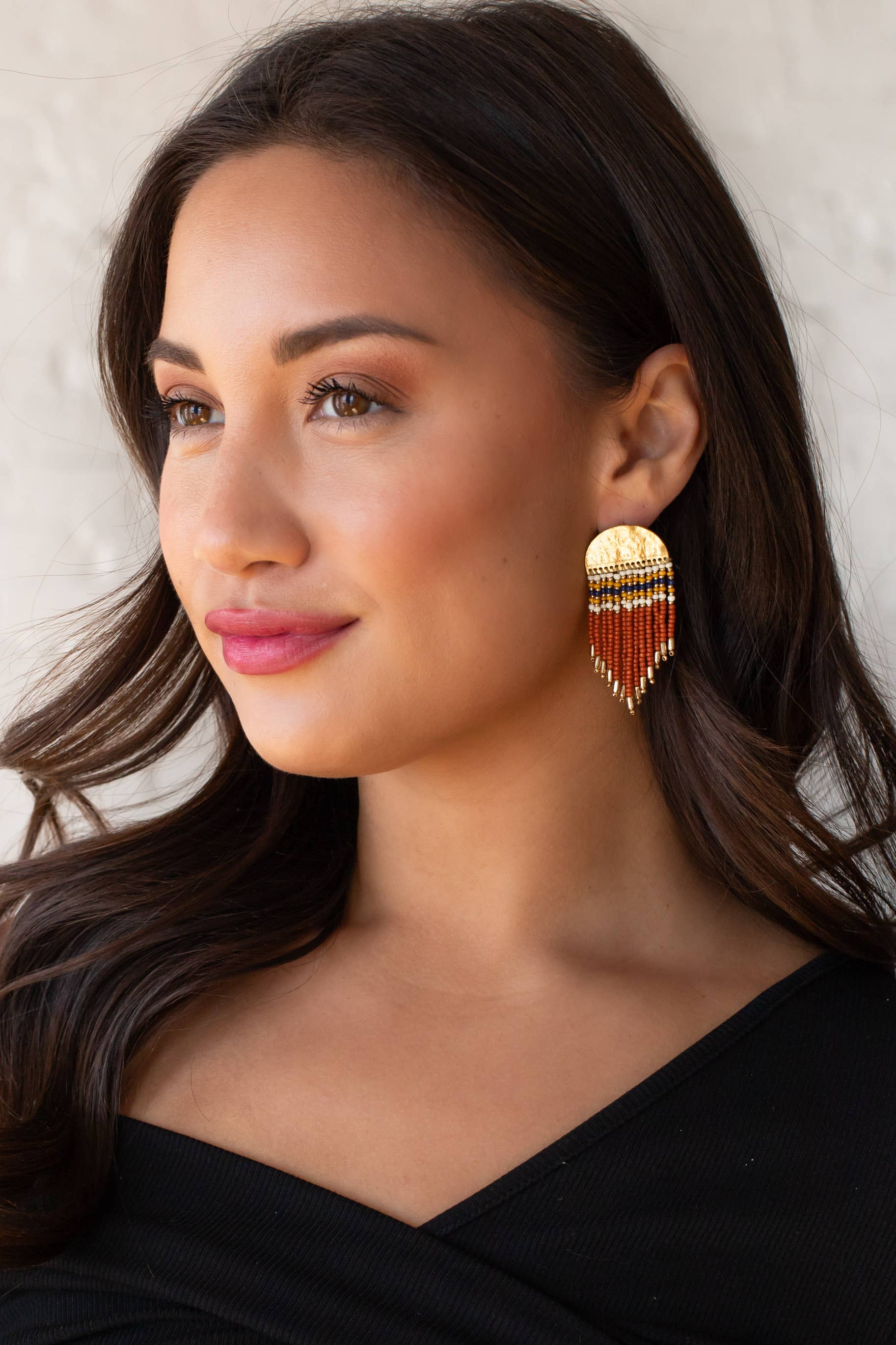 Rust, white, mustard & navy beaded fringe earrings Gold detail 2" length Lead and nickel free
