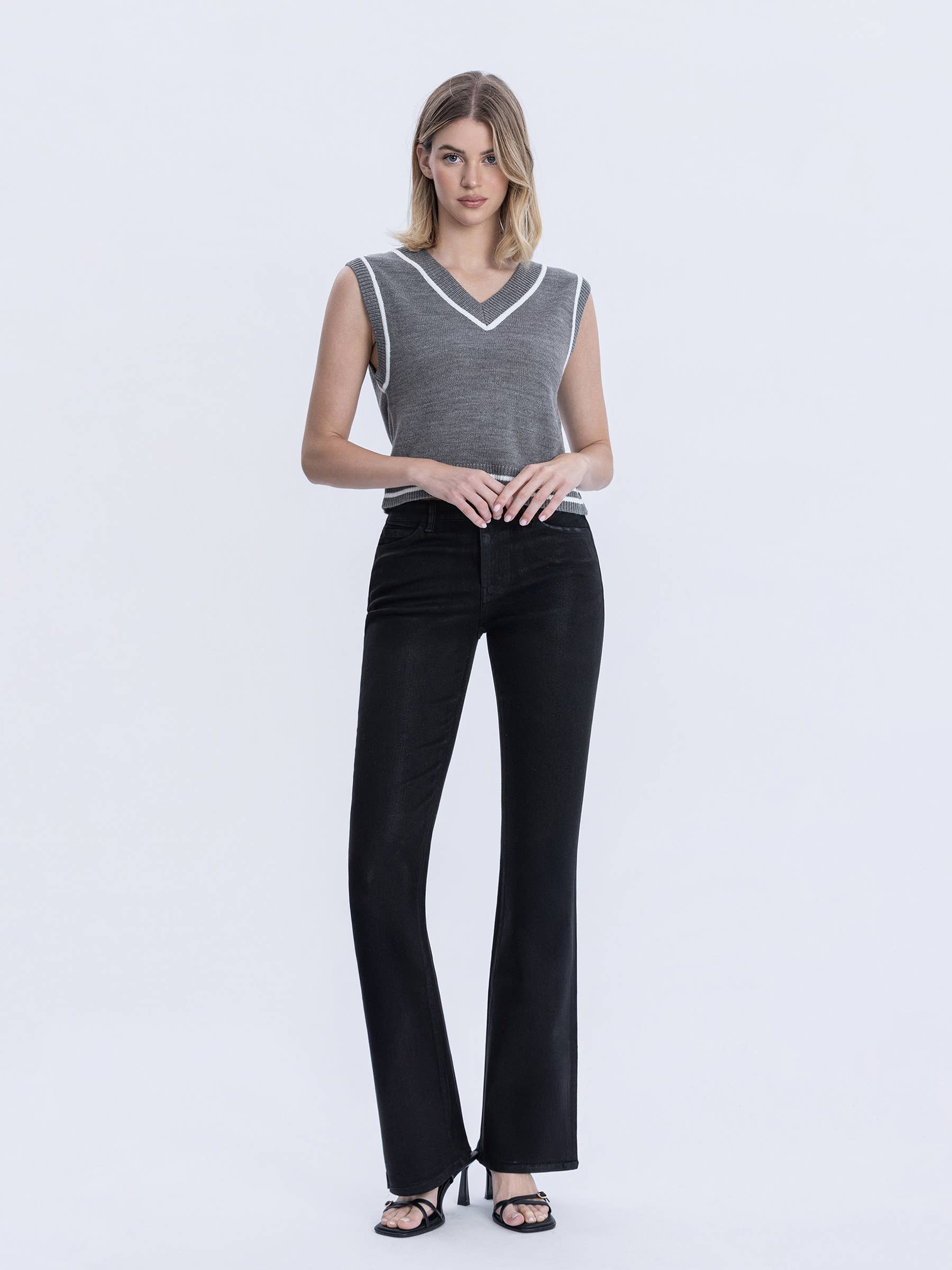 COMFORT STRETCH DENIM, HIGH RISE WAIST, FINISHED HEM, FULL LENGTH, BLACK BOOTCUT JEANS