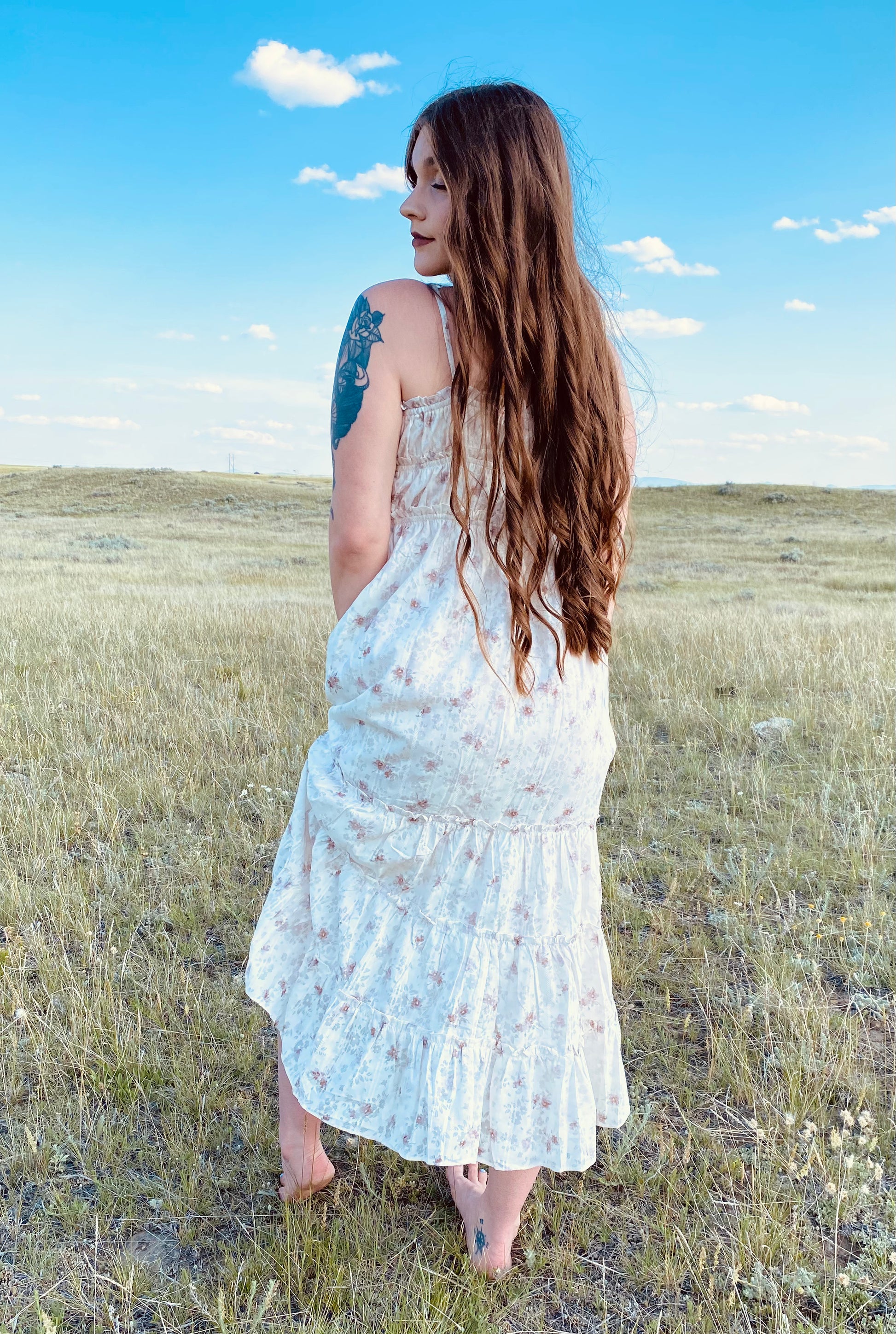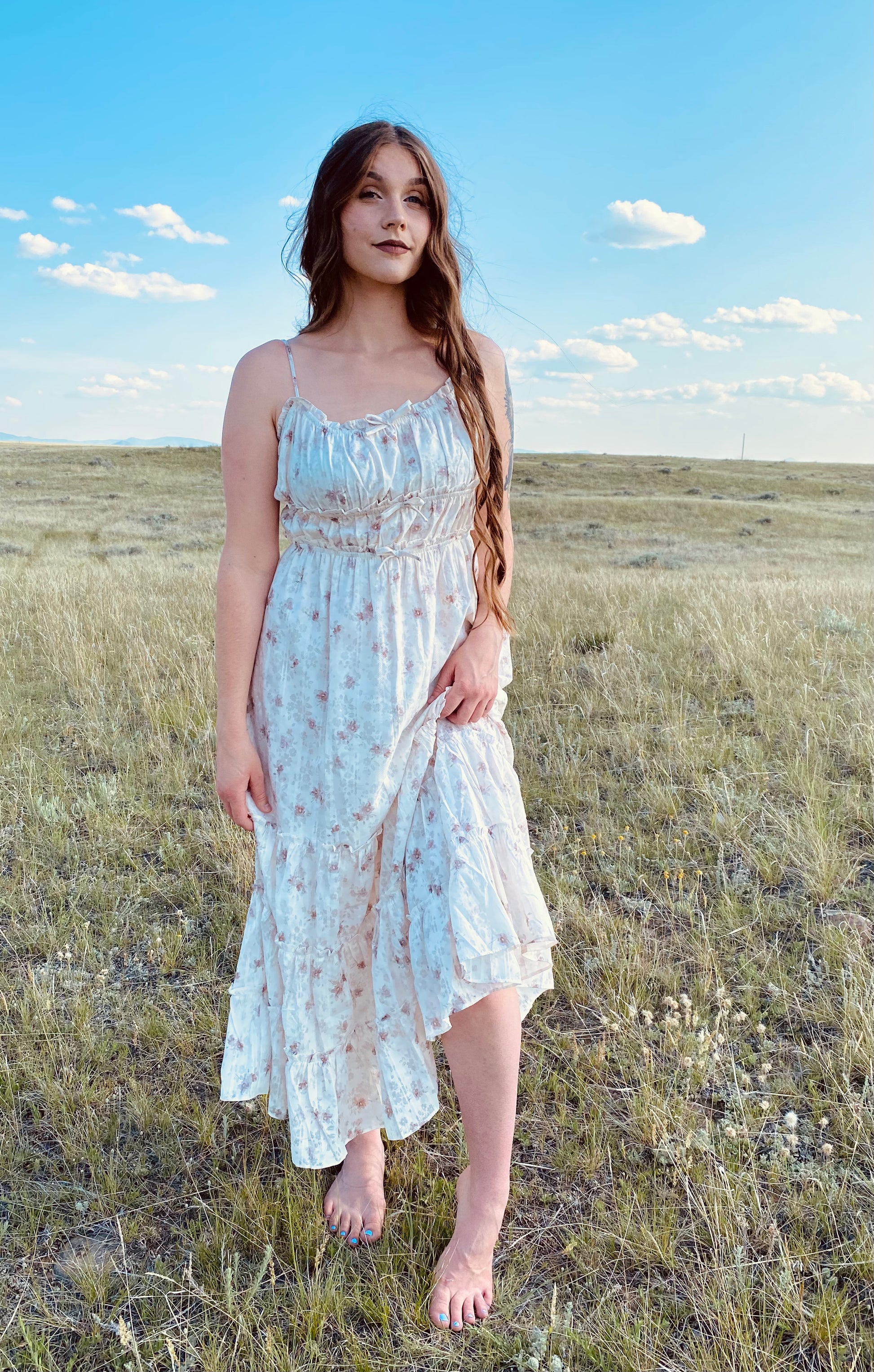 A charming floral print midi dress featuring a flattering silhouette with small, dainty bow details at the front, adding a touch of sweetness.