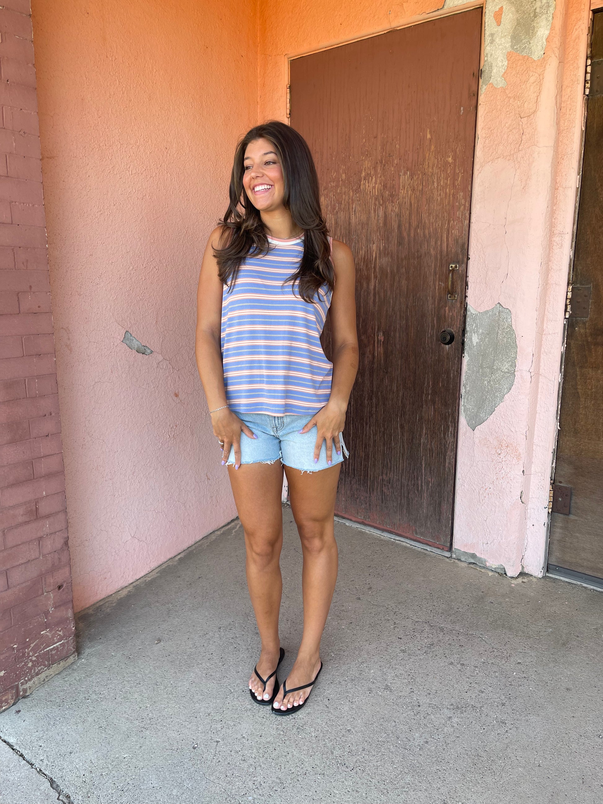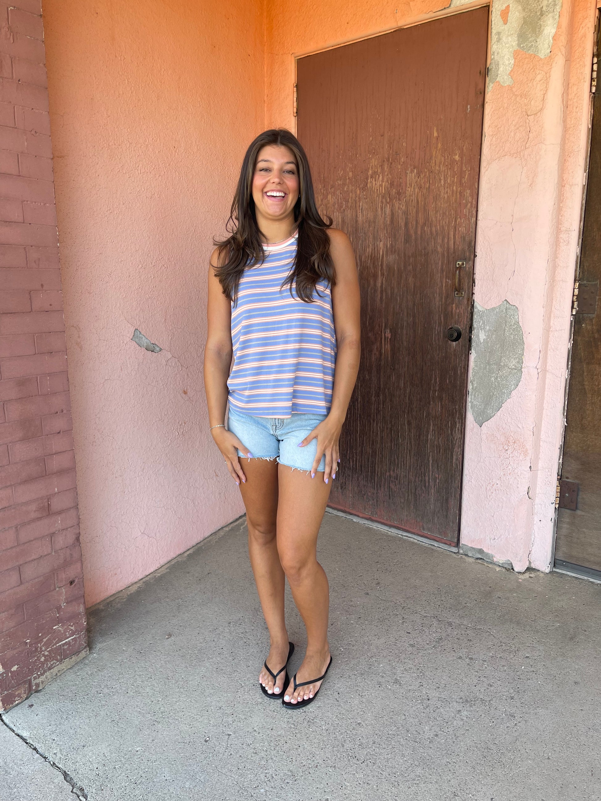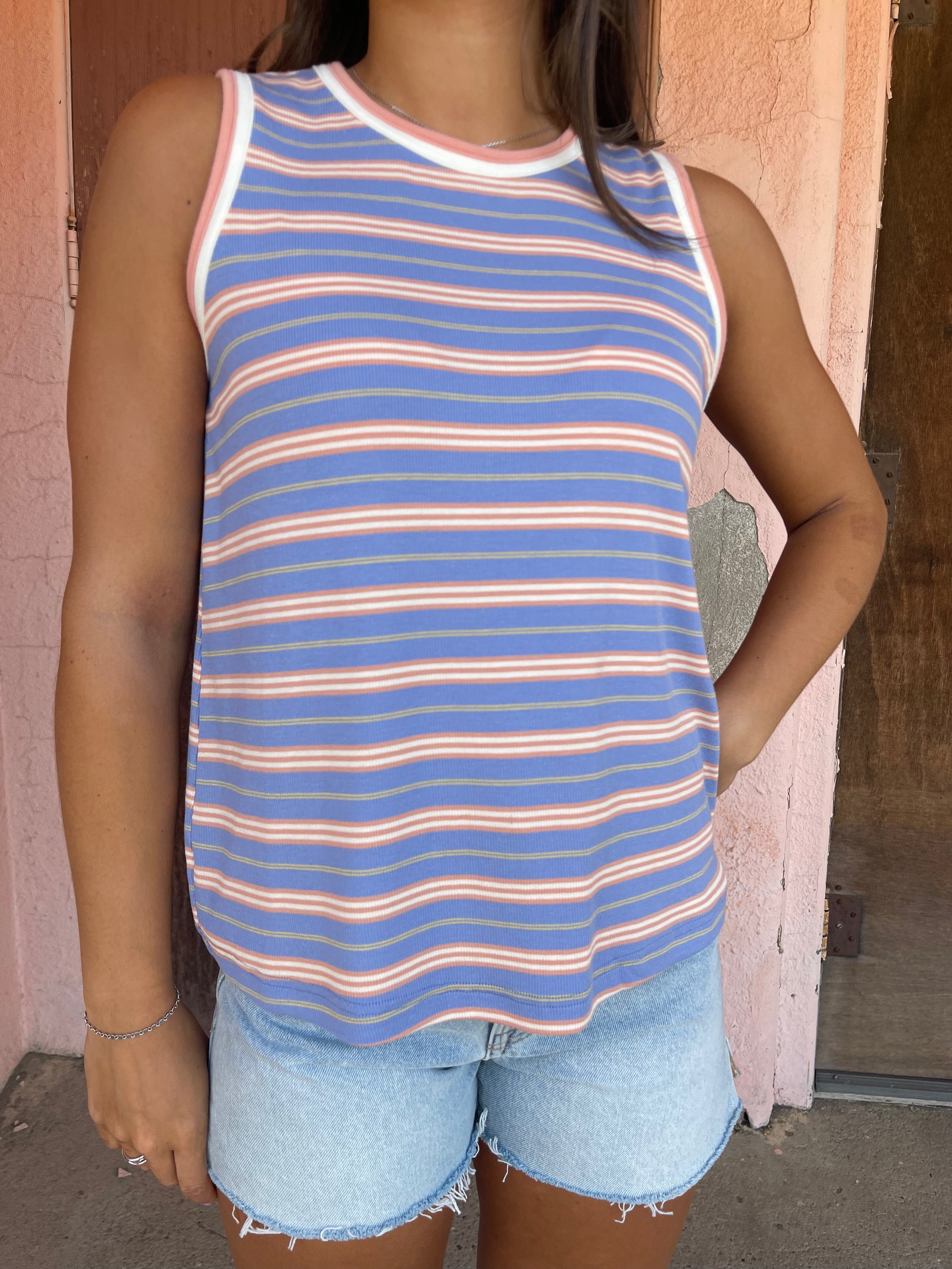 CREW NECK, SLEEVELESS, MULTI STRIPED, BABY RIB JERSEY TOP
