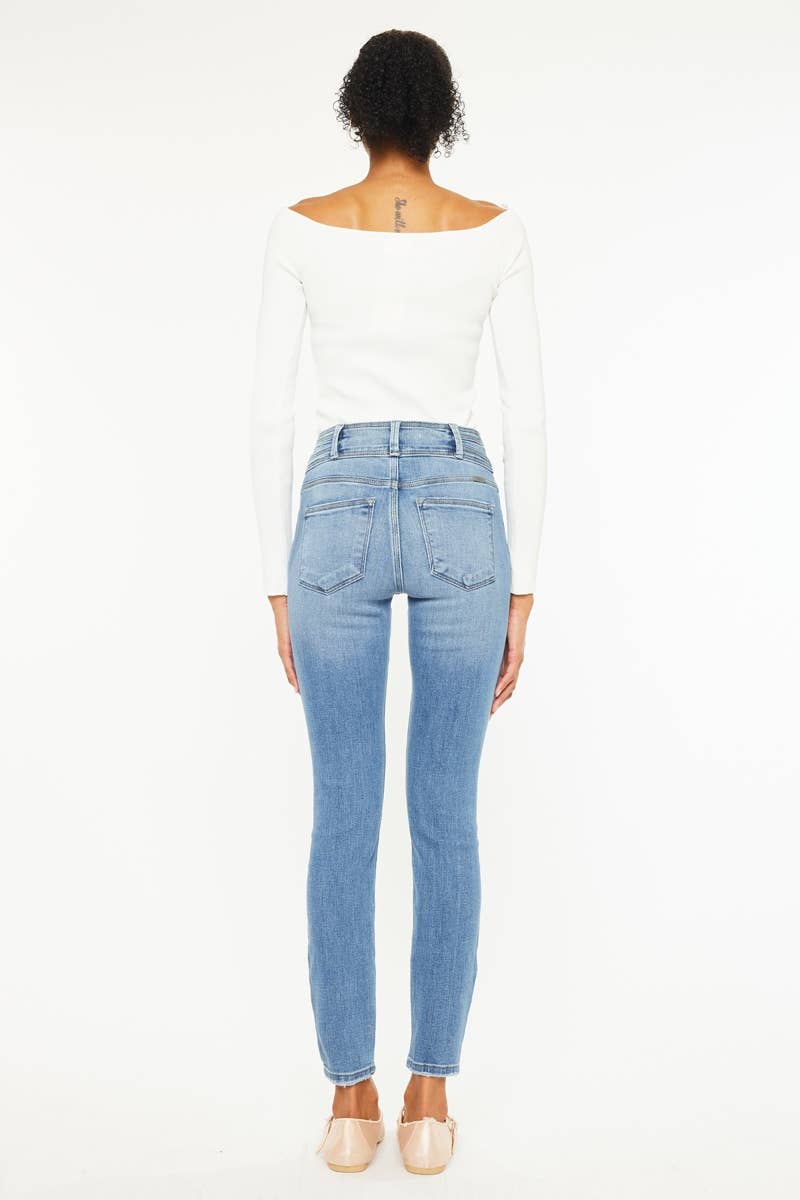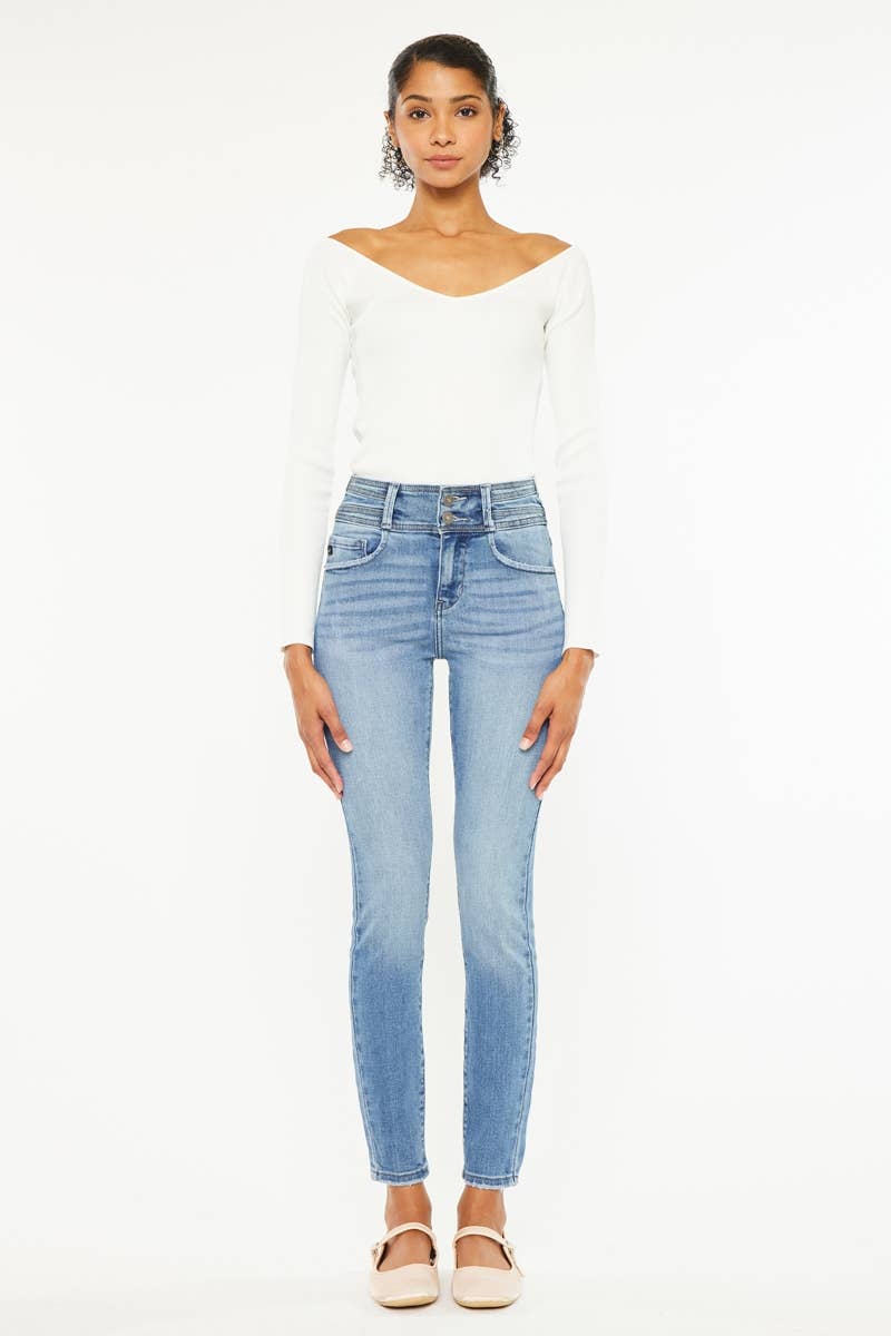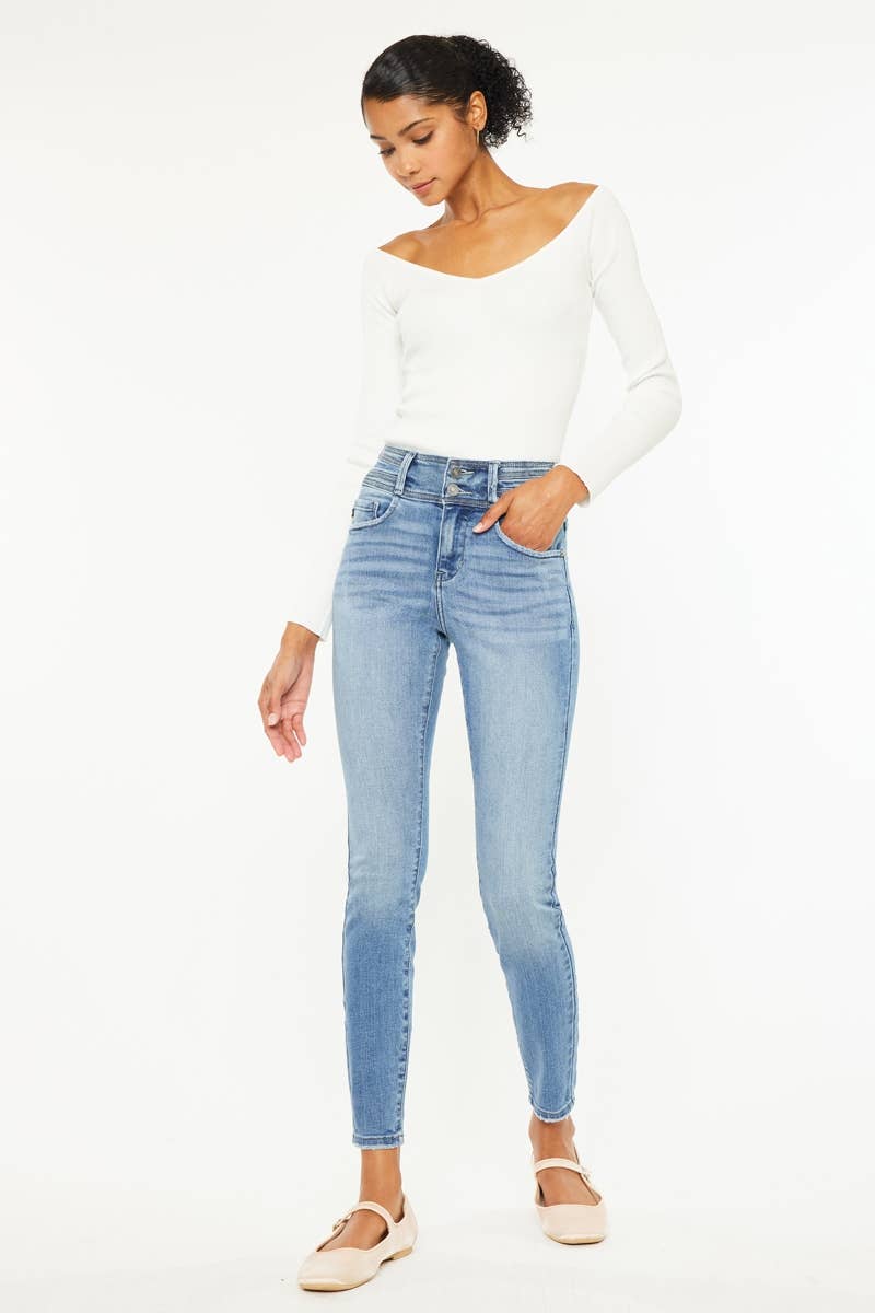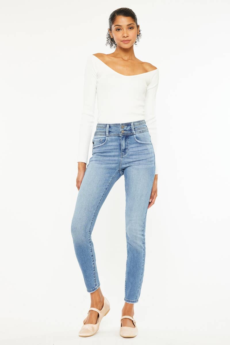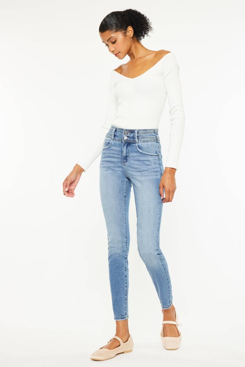 HIGH RISE DOUBLE BUTTON WB SUPER SKINNY JEANS MEDIUM WASH SUPER STRETCH 2 3/4" WIDE WB TRIPLE STITCH CUT SEAM AND WB TWO BUTTON ZIP FLY