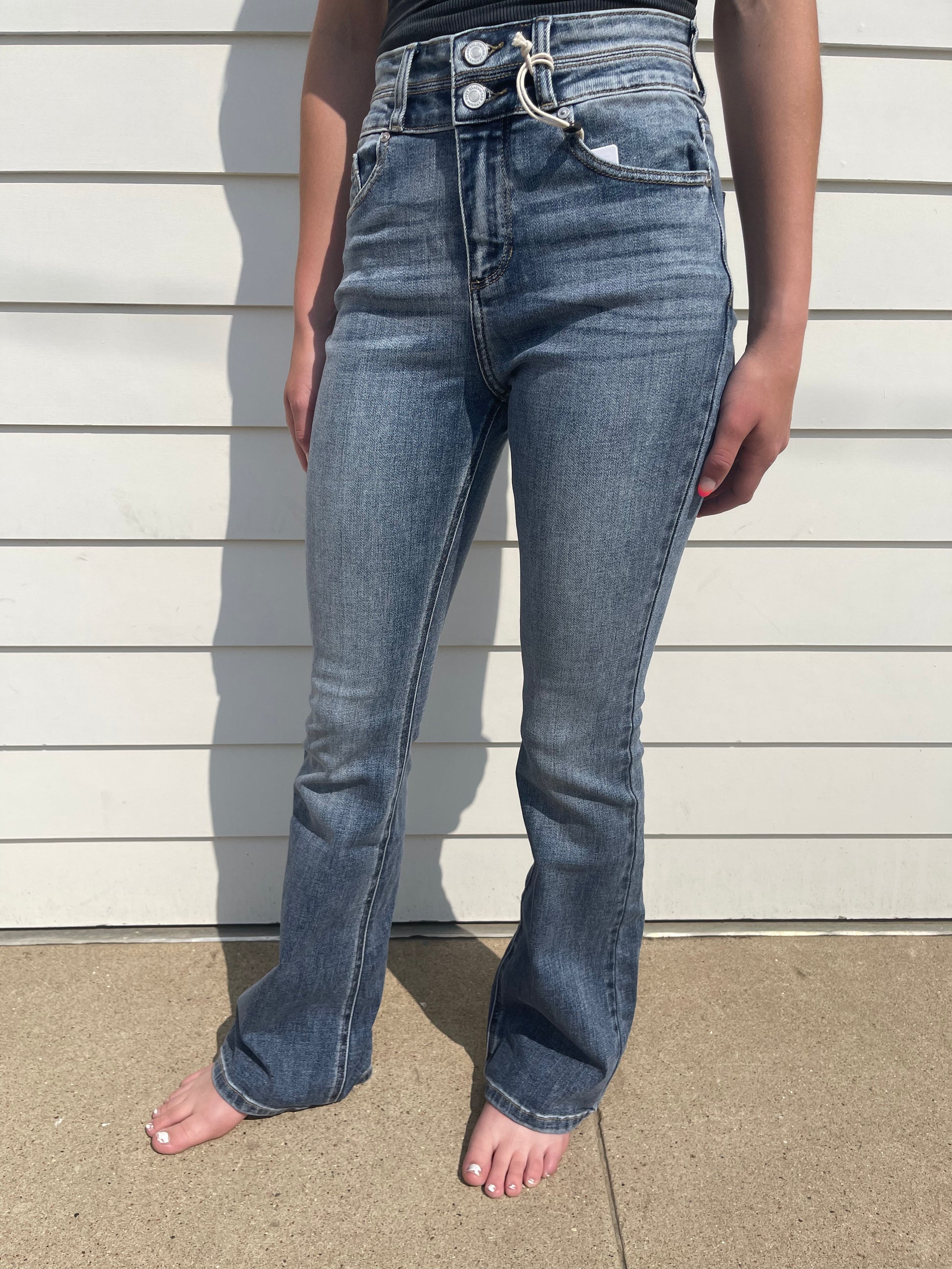HIGH RISE SKINNY BOOTCUT MEDIUM WASH SUPER STRETCH 5 POCKET STYLE DOUBLE WAISTBAND DOUBLE BUTTON & ZIPPER FLY 9 1/2" LEG OPENING RISE 11" INSEAM 33" IN SIZE 5 /26 93% COTTON, 6% POLYESTER, 1% SPANDEX. 10.5 OZ