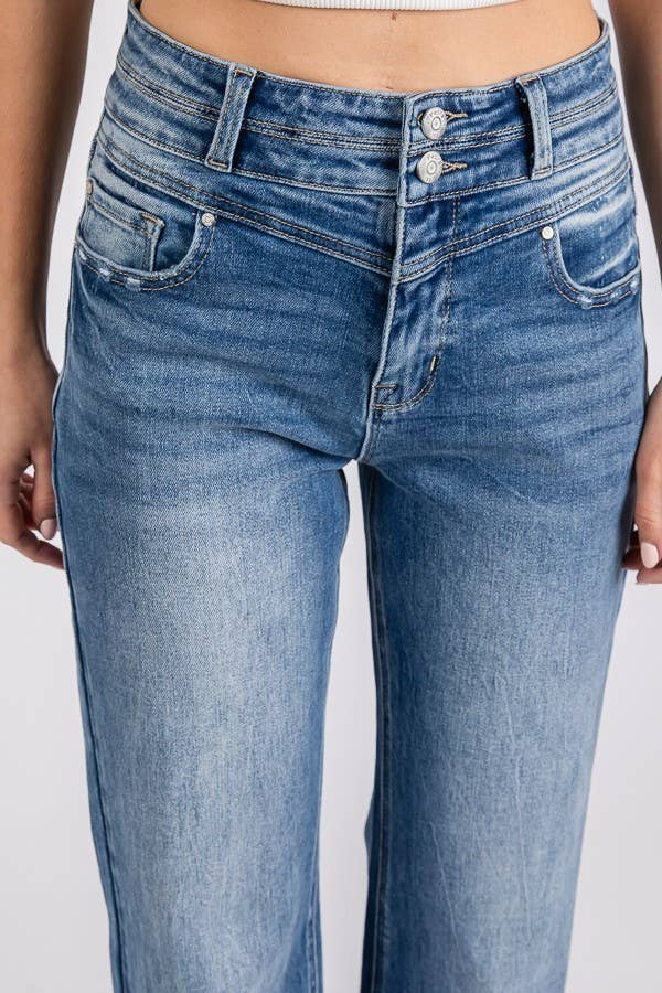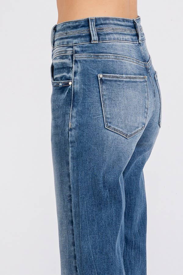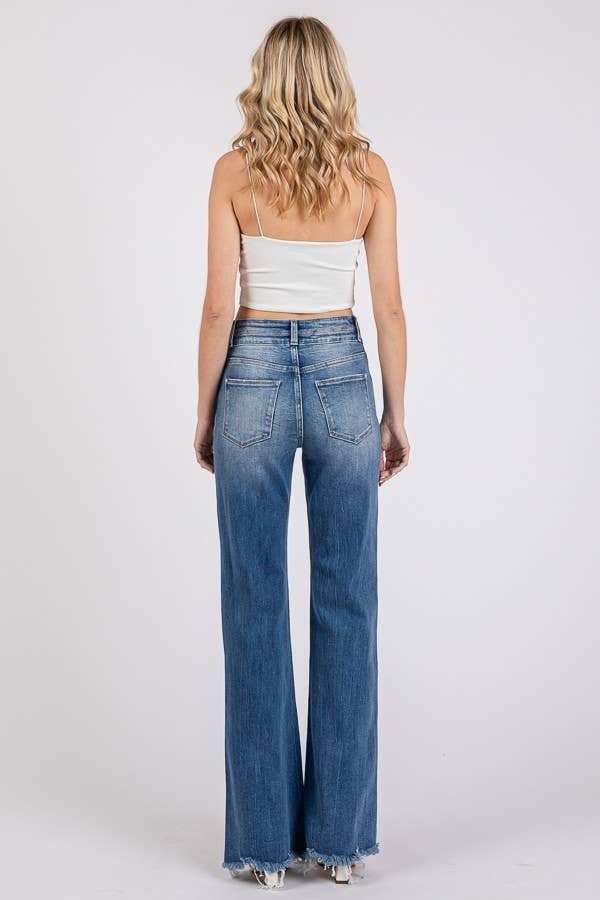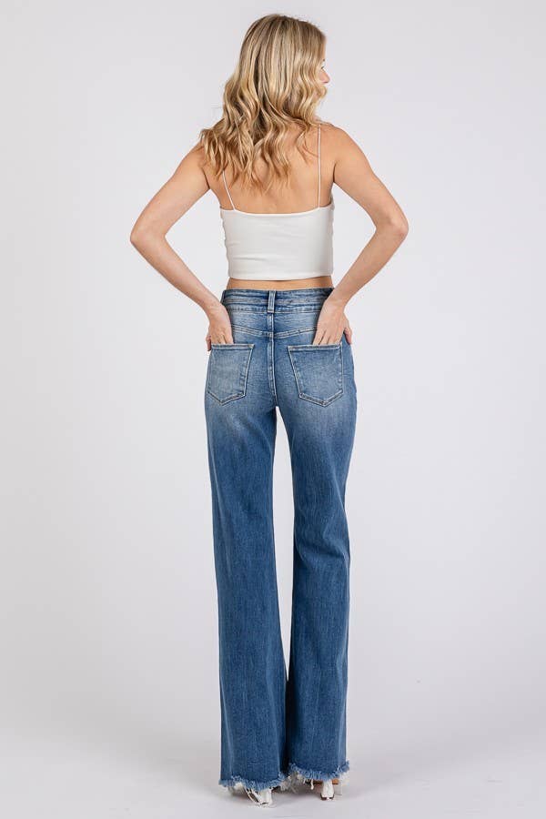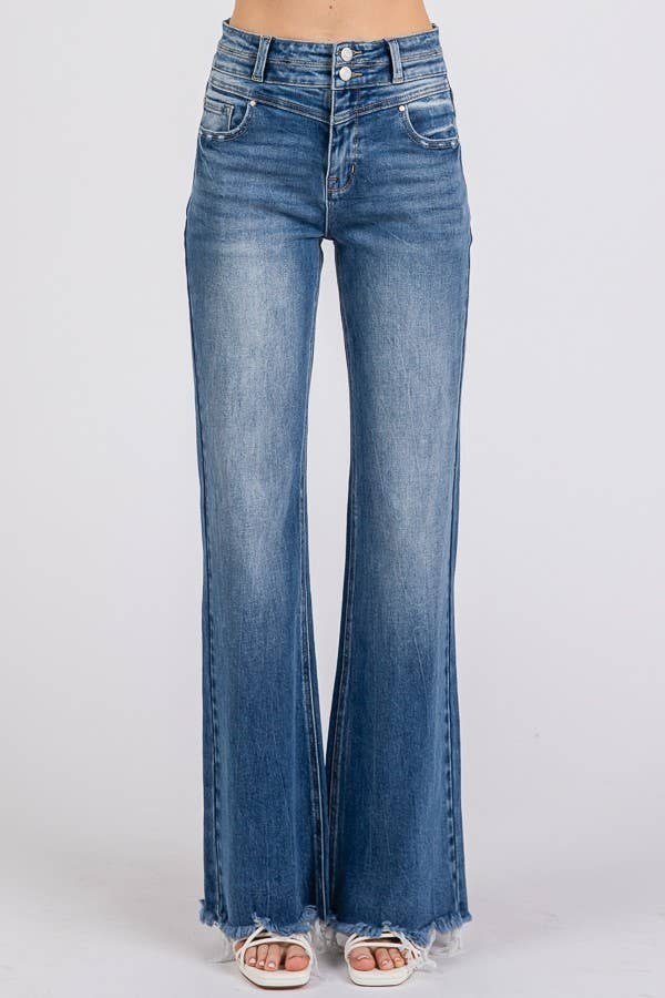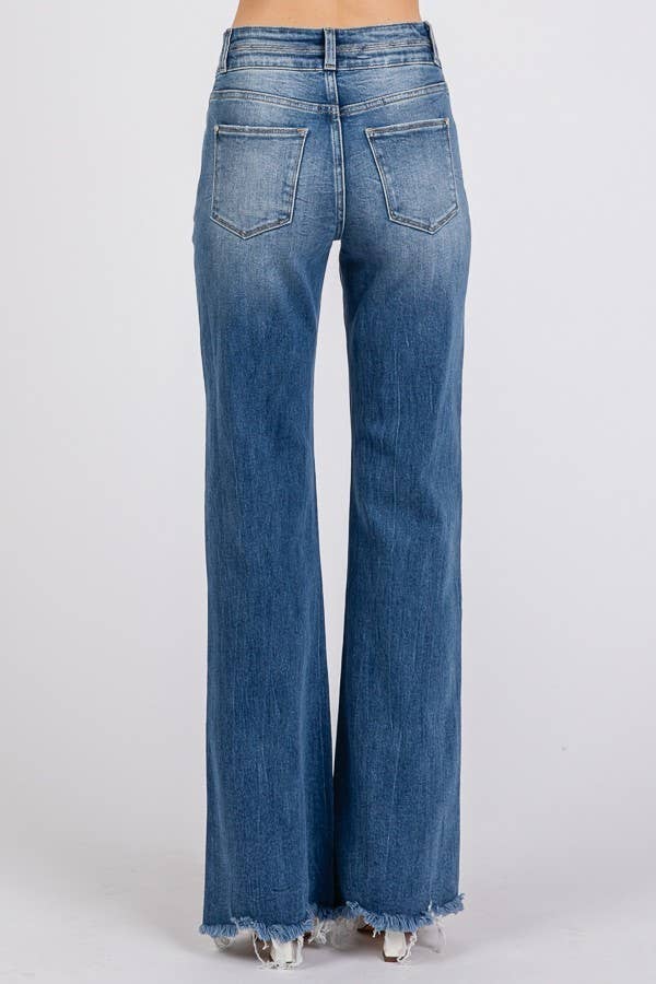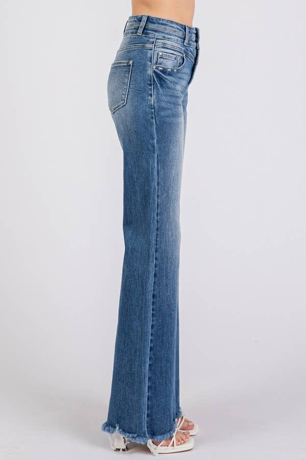 HIGH RISE STRETCH WIDE LEG FLARE W/ FRAYED HEM JEANS