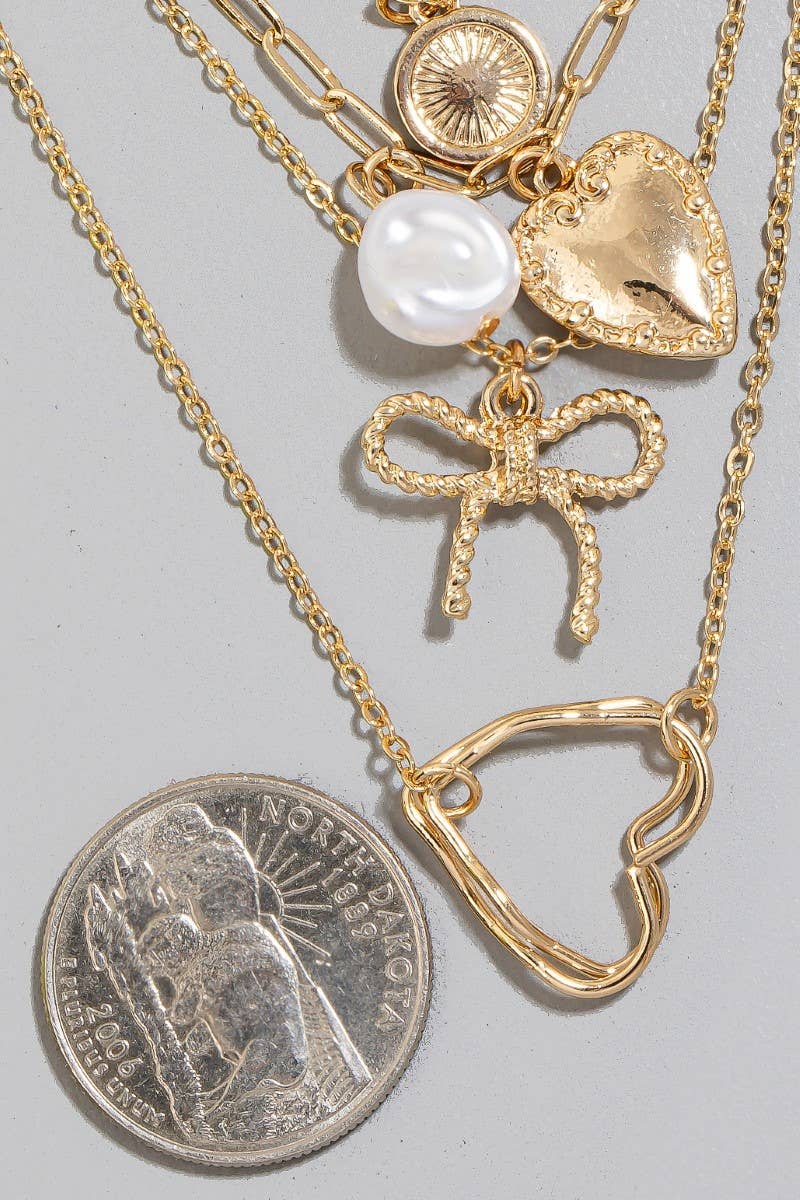 This necklace brings a luxurious pearl heart ribbon bow charms layered chains style. Immerse yourself in the details of design, as this necklace effortlessly becomes a conversation starter.