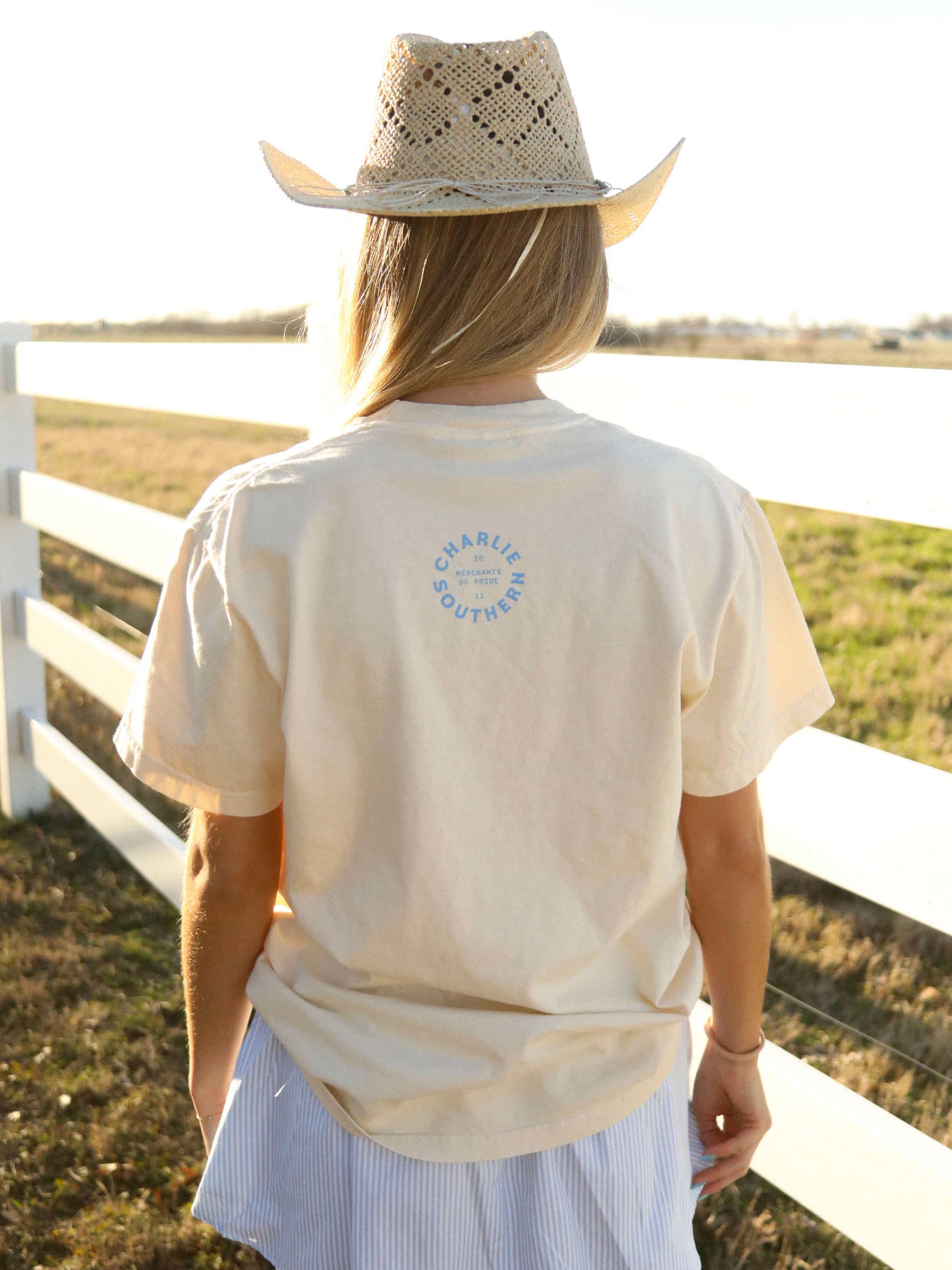Our best selling design is back again this year on a new ivory tee in a blue and green graphic. This one is such a fun color way for spring and summer.