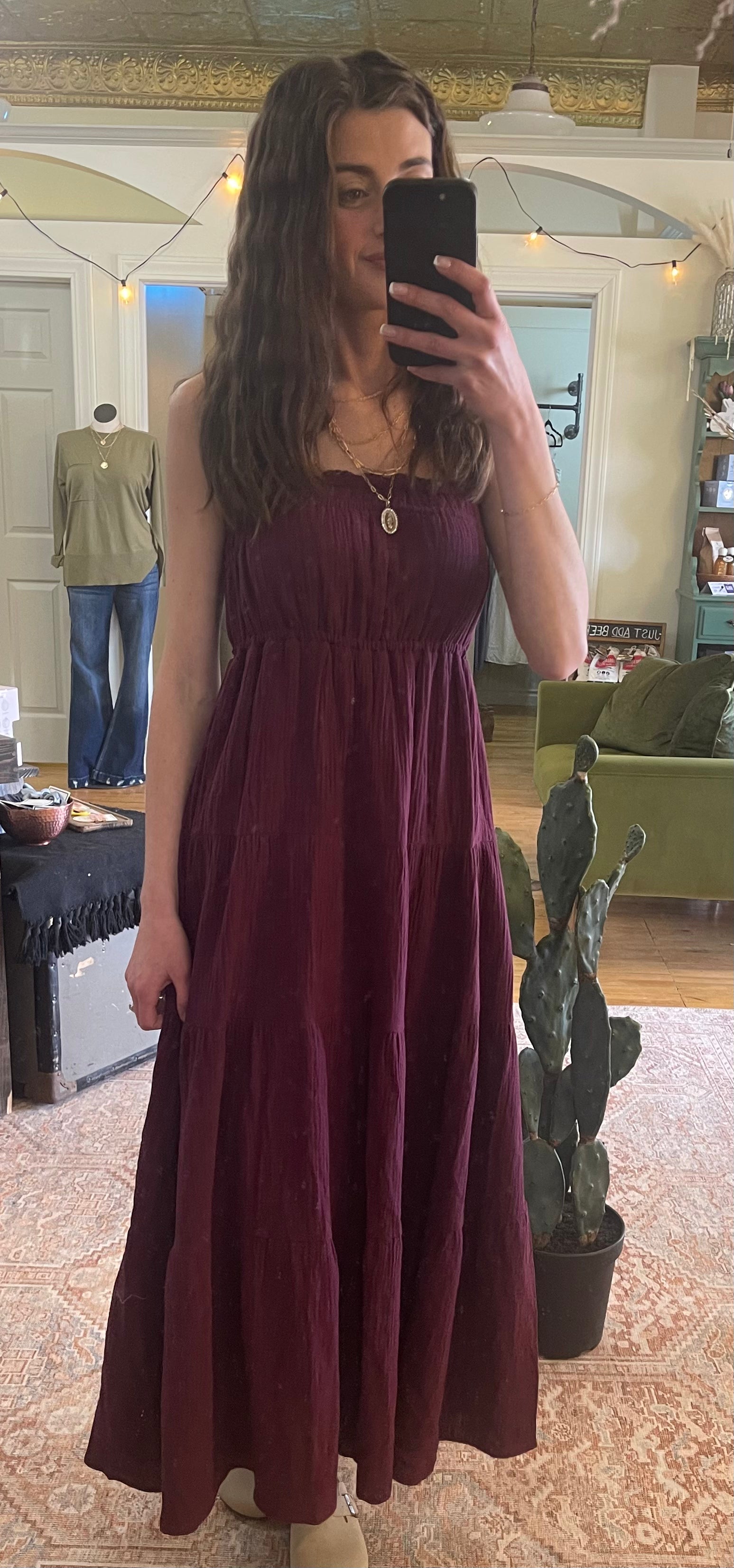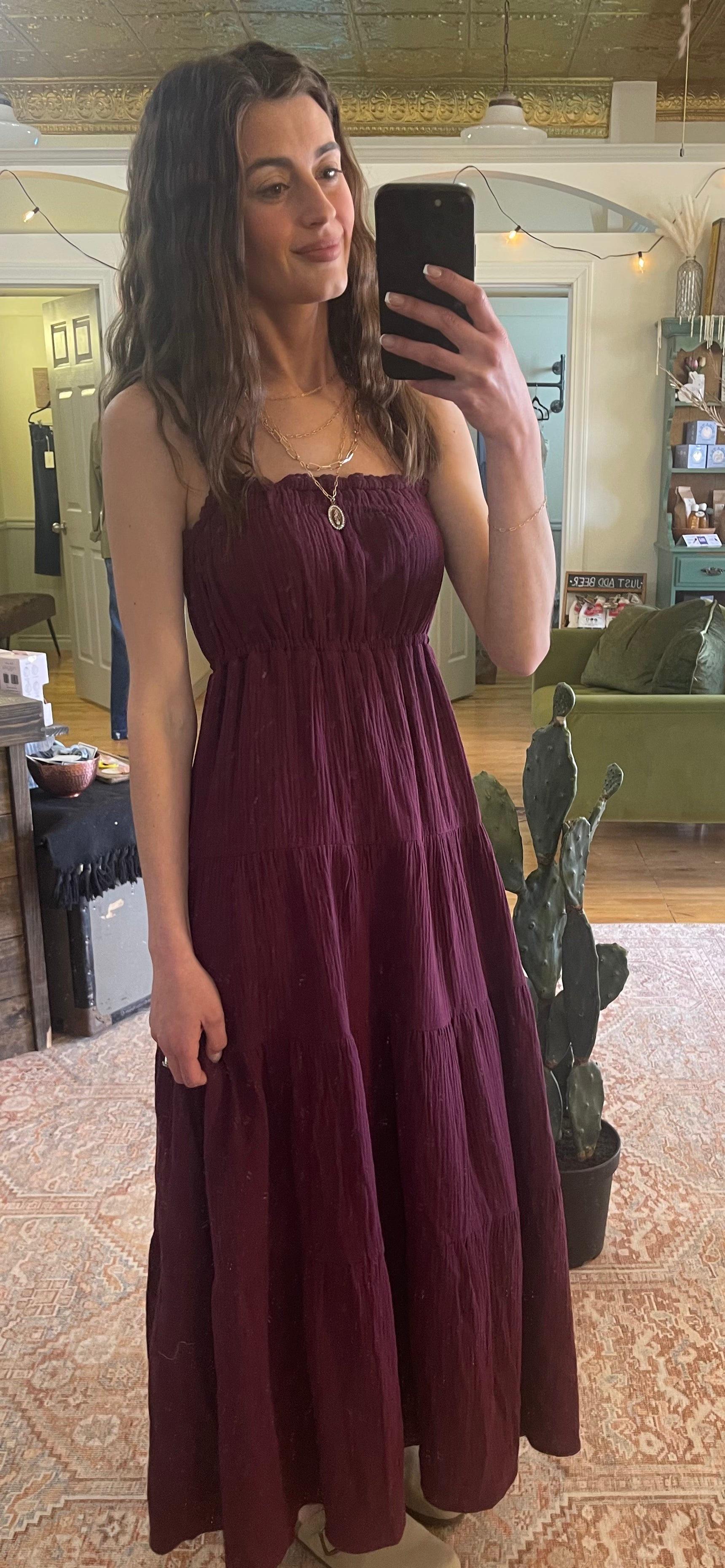 SMOCKED TIERED MAXI SUNDRESS: PLUM