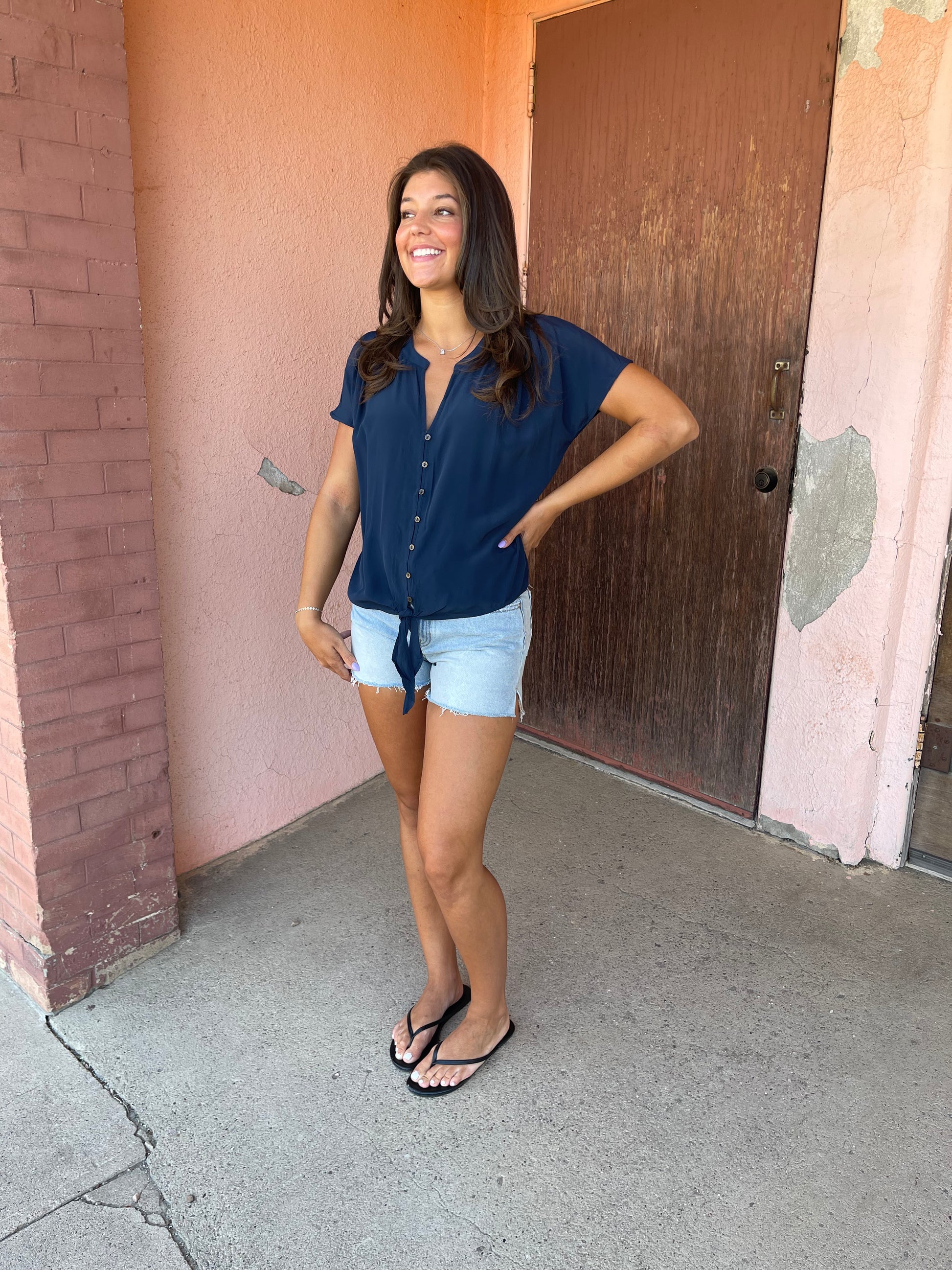 A short sleeve blouse featuring a split neckline, tie front, functional button front, and pleated details. Perfect casual top to pair with jeans or shorts.