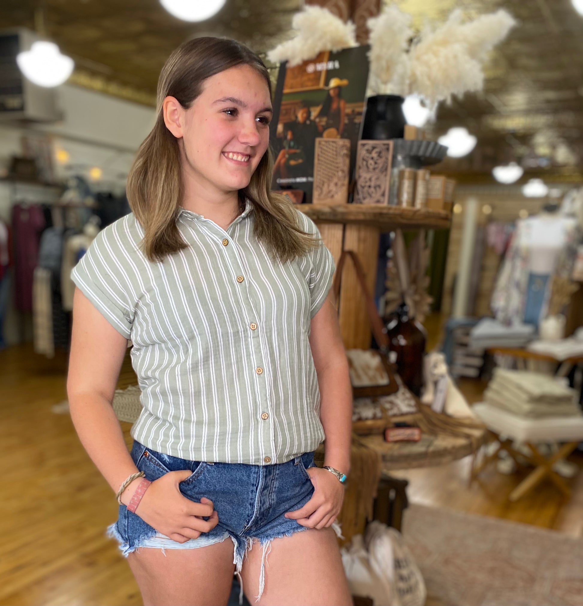 A short sleeve version of the classic button-down, this 100% breezy cotton shirt is featured in a striped fabrication and collared-neckline. Wear with the Verna Pant to complete the matching set.
