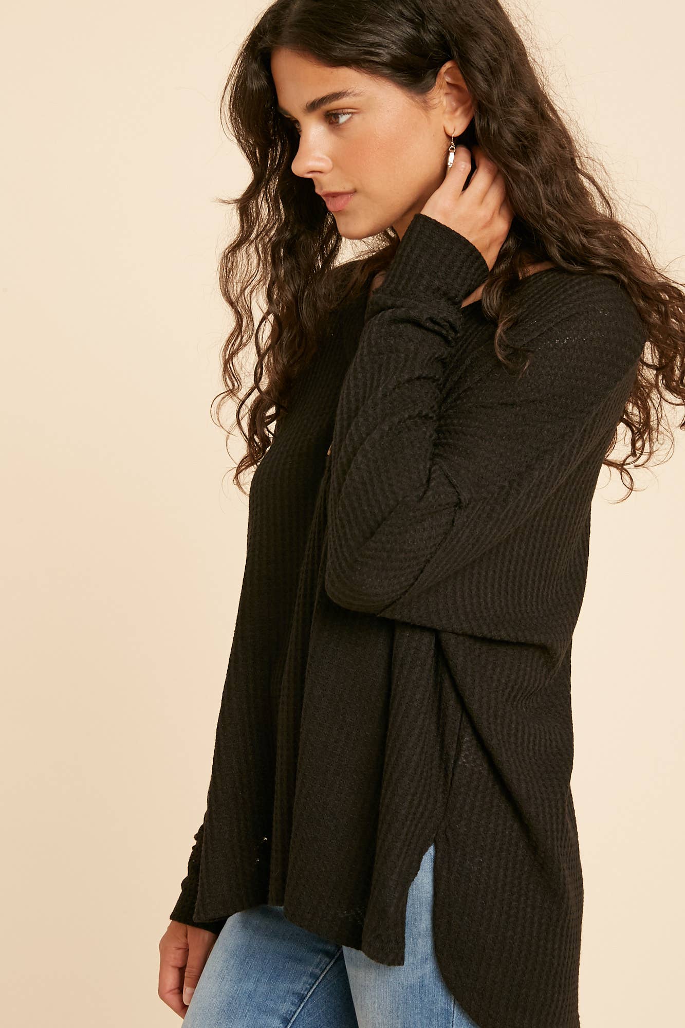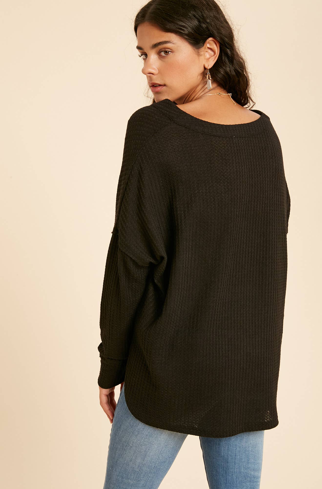 LONG SLEEVE LOOSE FIT V NECK WAFFLE KNIT HENLEY WITH BUTTON DETAILS. THIS ADORABLE BASIC IS PERFECT FOR THE EVERYDAY WEAR!