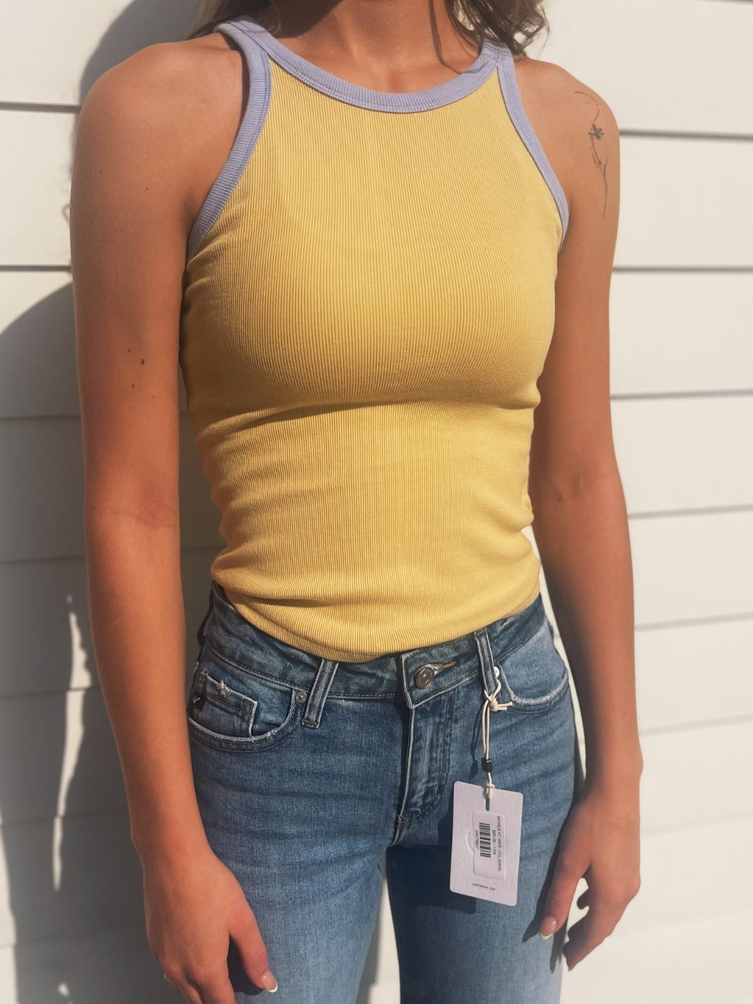 - Made with stretchy ribbed fabric, featuring contrast binding details as a key point.