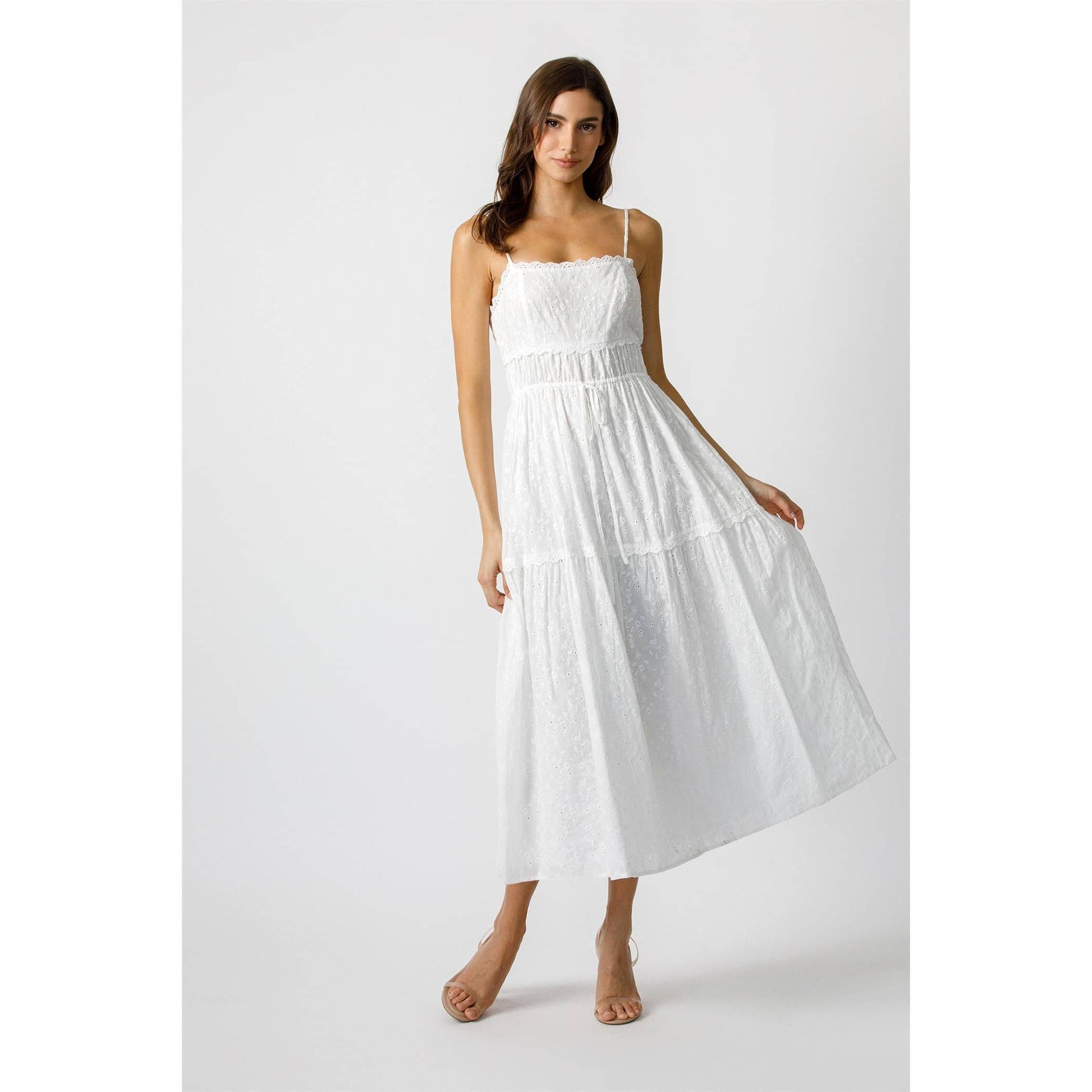 This timeless white midi dress is a celebration of elegance and simplicity. Featuring delicate eyelet embroidery and a scalloped neckline, it exudes a fresh and feminine charm. The adjustable spaghetti straps and smocked back ensure a comfortable fit, while the cinched waist with a subtle tie accentuates the silhouette.
