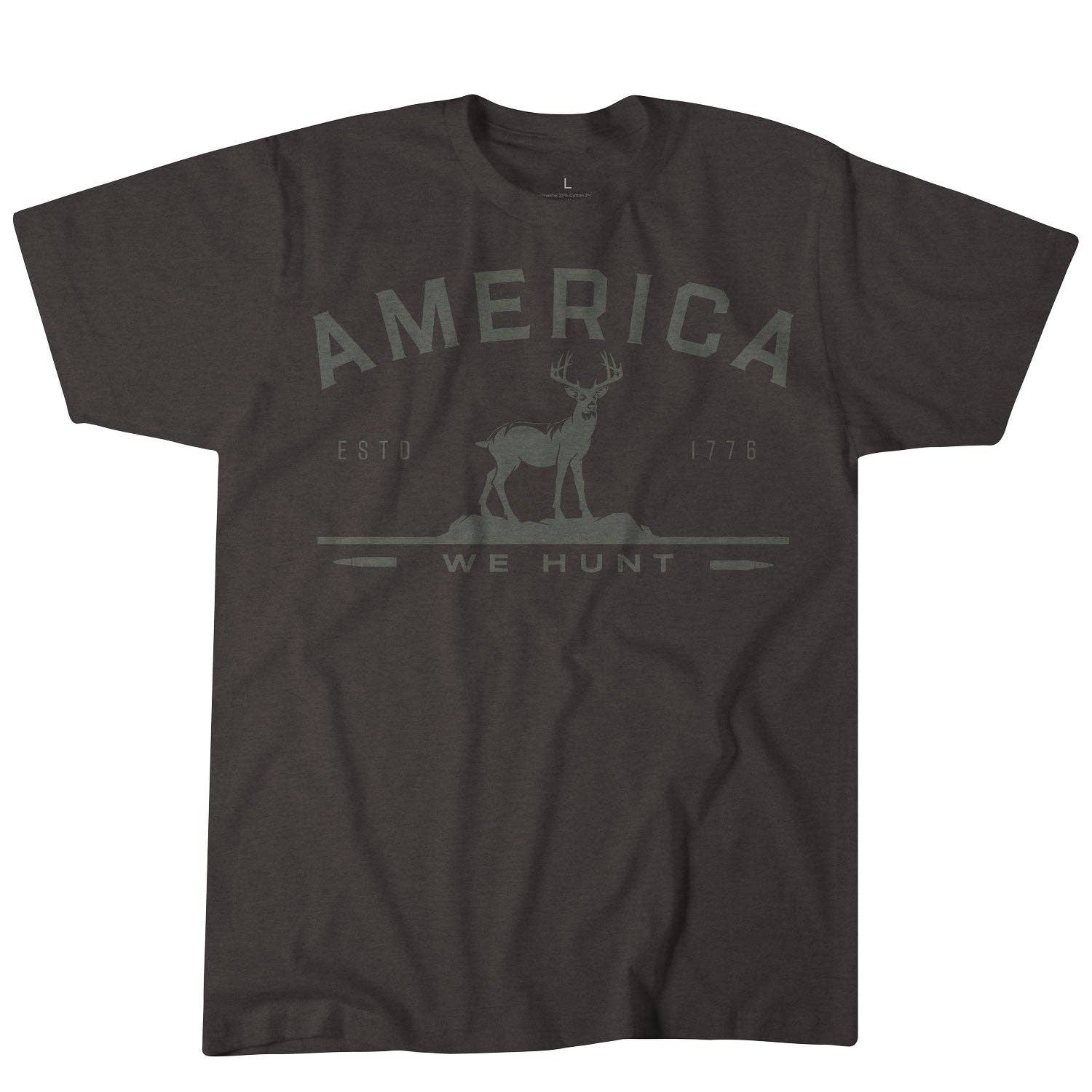 The America Tee pays tribute to America’s most iconic game animal. With a bold front print of a proud buck and “We Hunt” lettering, it’s built for those who carry the tradition forward. Soft, durable, and ready for camp, stand, or street. * 60/40 poly-cotton blend for comfort and resilience * Distressed buck graphic with “We Hunt” banner * Athletic fit for active wear * Tagless neck for all-day comfort * Built for hunters, outdoorsmen, and patriots