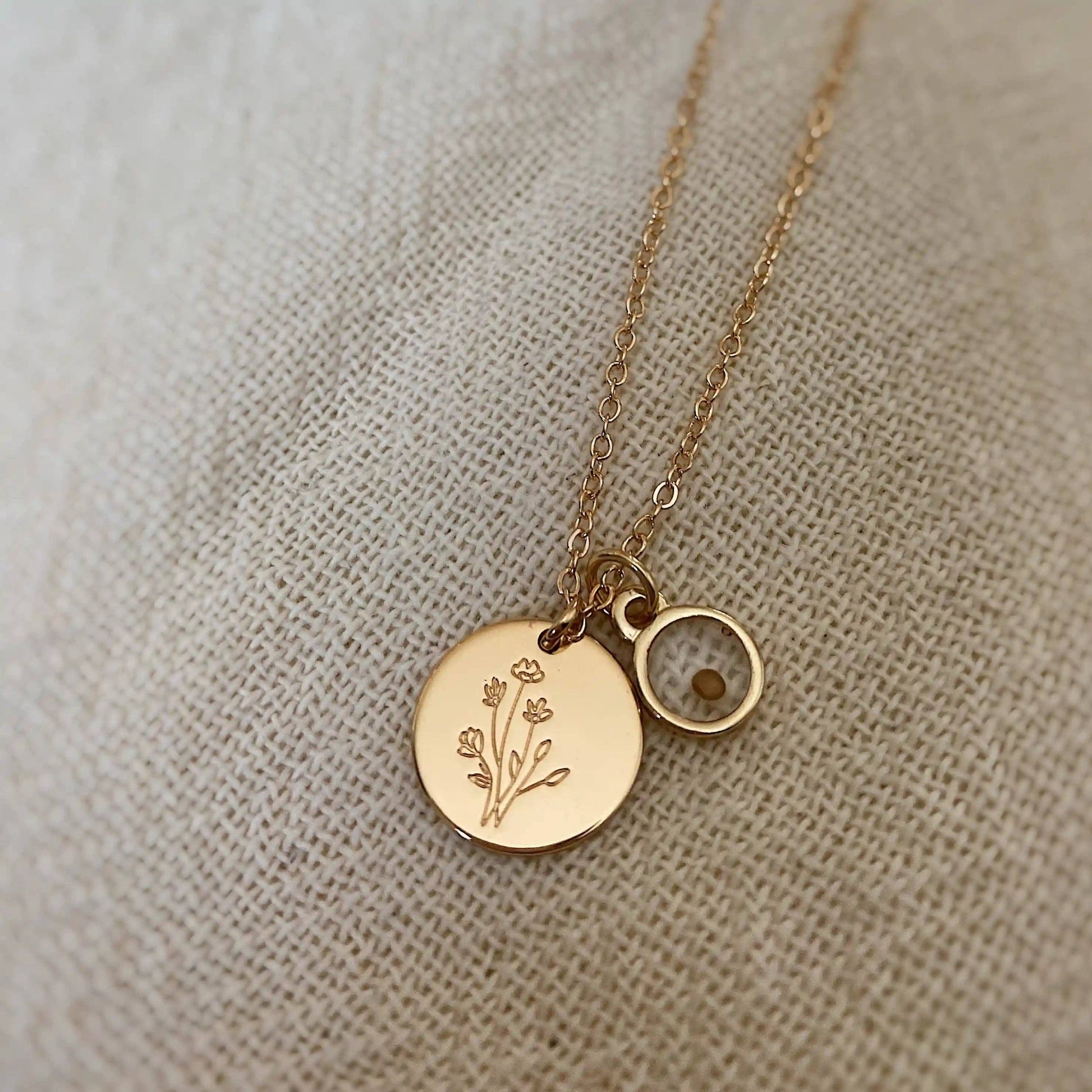 The wildflower Necklace with Mustard Seed is 18k gold plated. The chain is 18 inches with a 2" extender up to 20".