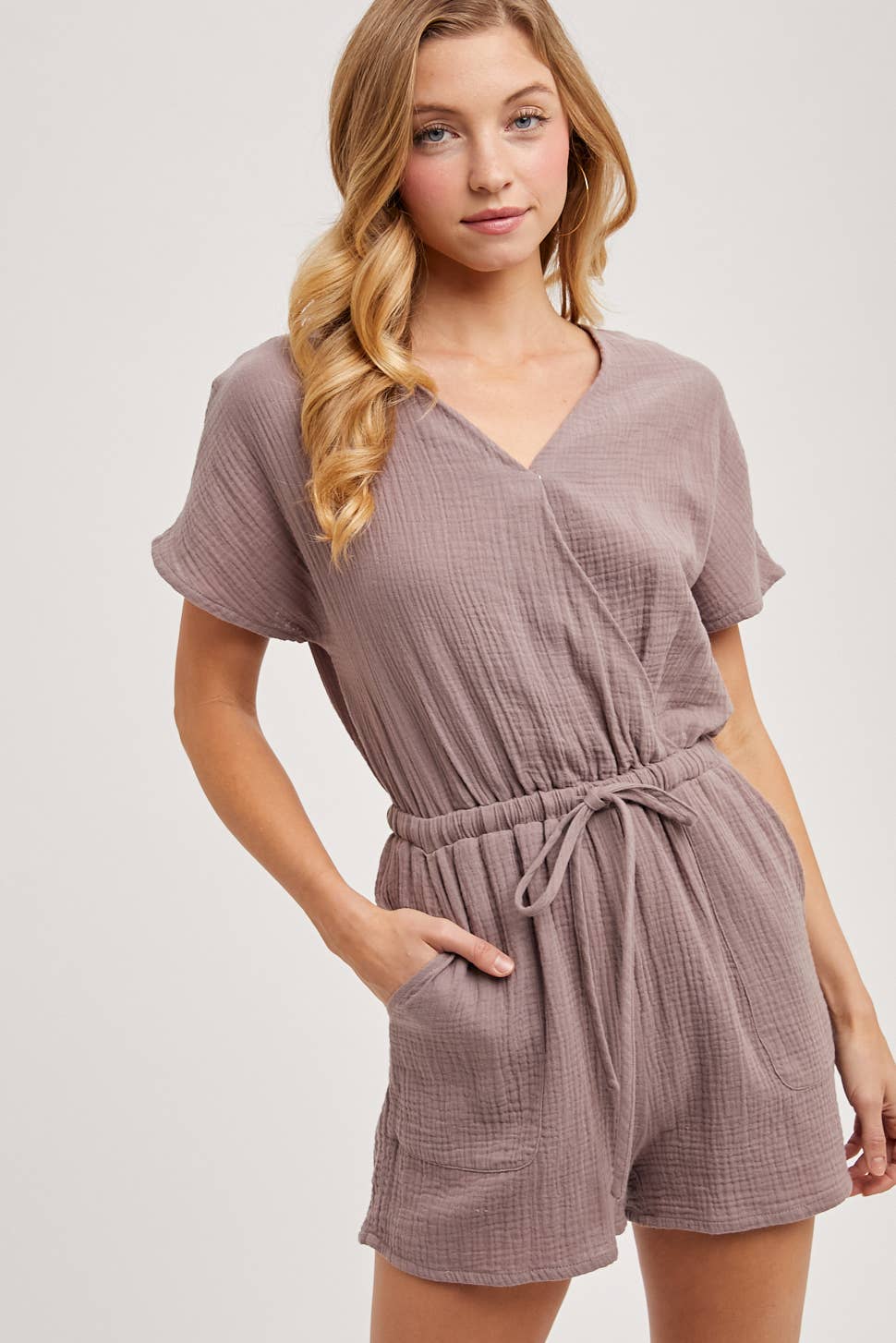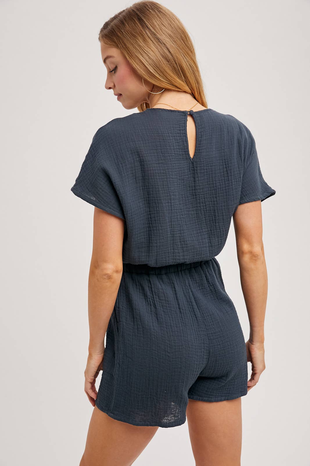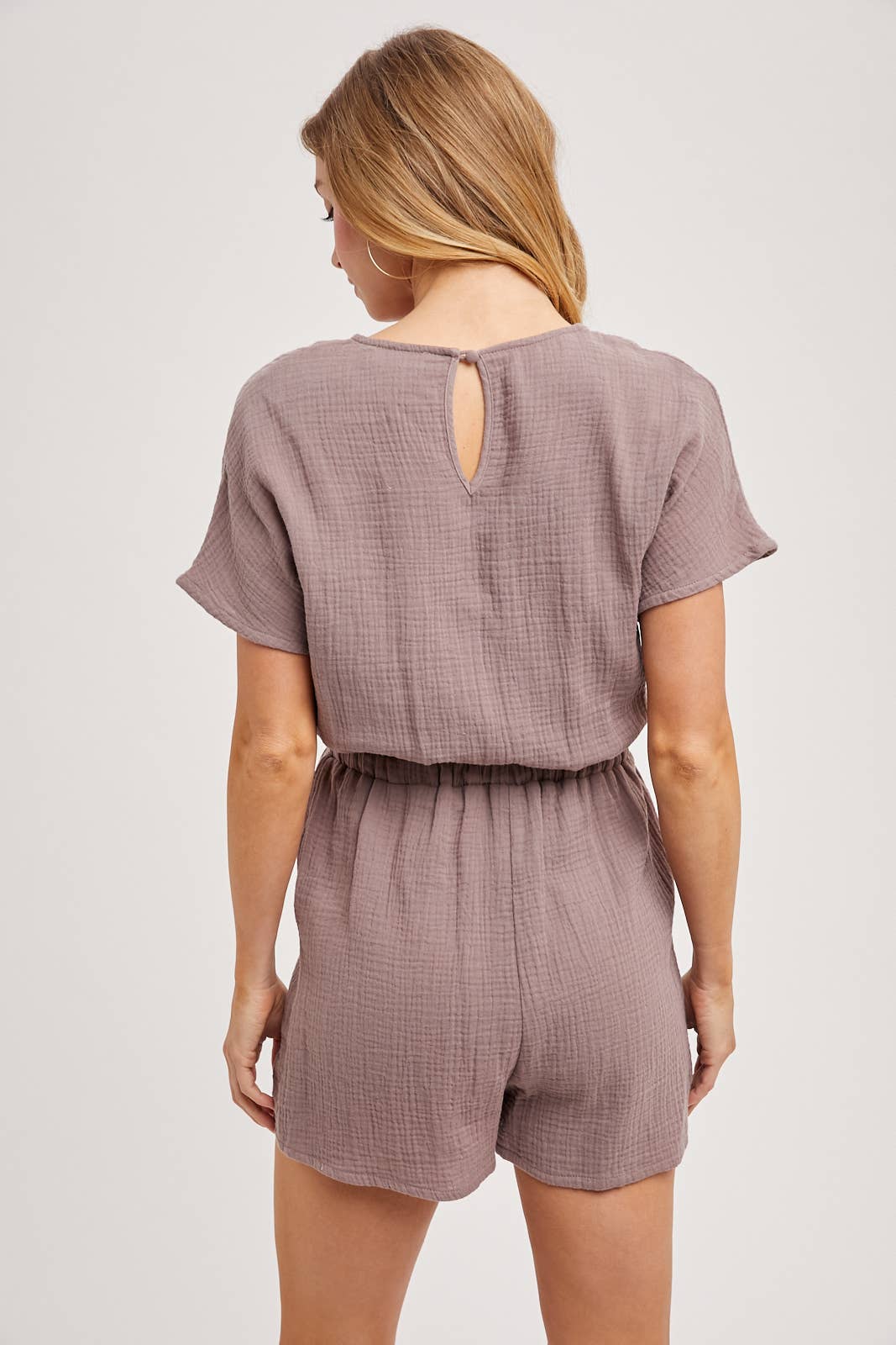 The Wrap Waist Drawstring Romper with Short Sleeves and Side Pockets is a versatile and chic one-piece outfit. Featuring a wrap-style design at the waist, this romper adds a touch of sophistication to your look. The drawstring allows you to customize the fit to your liking, ensuring comfort and style. The short sleeves provide a relaxed and breezy feel, perfect for warm days or casual occasions. With convenient side pockets, this romper combines fashion with functionality. Whether you're dressing up for a day out or keeping it casual, this romper offers an effortlessly stylish and comfortable option for various occasions.