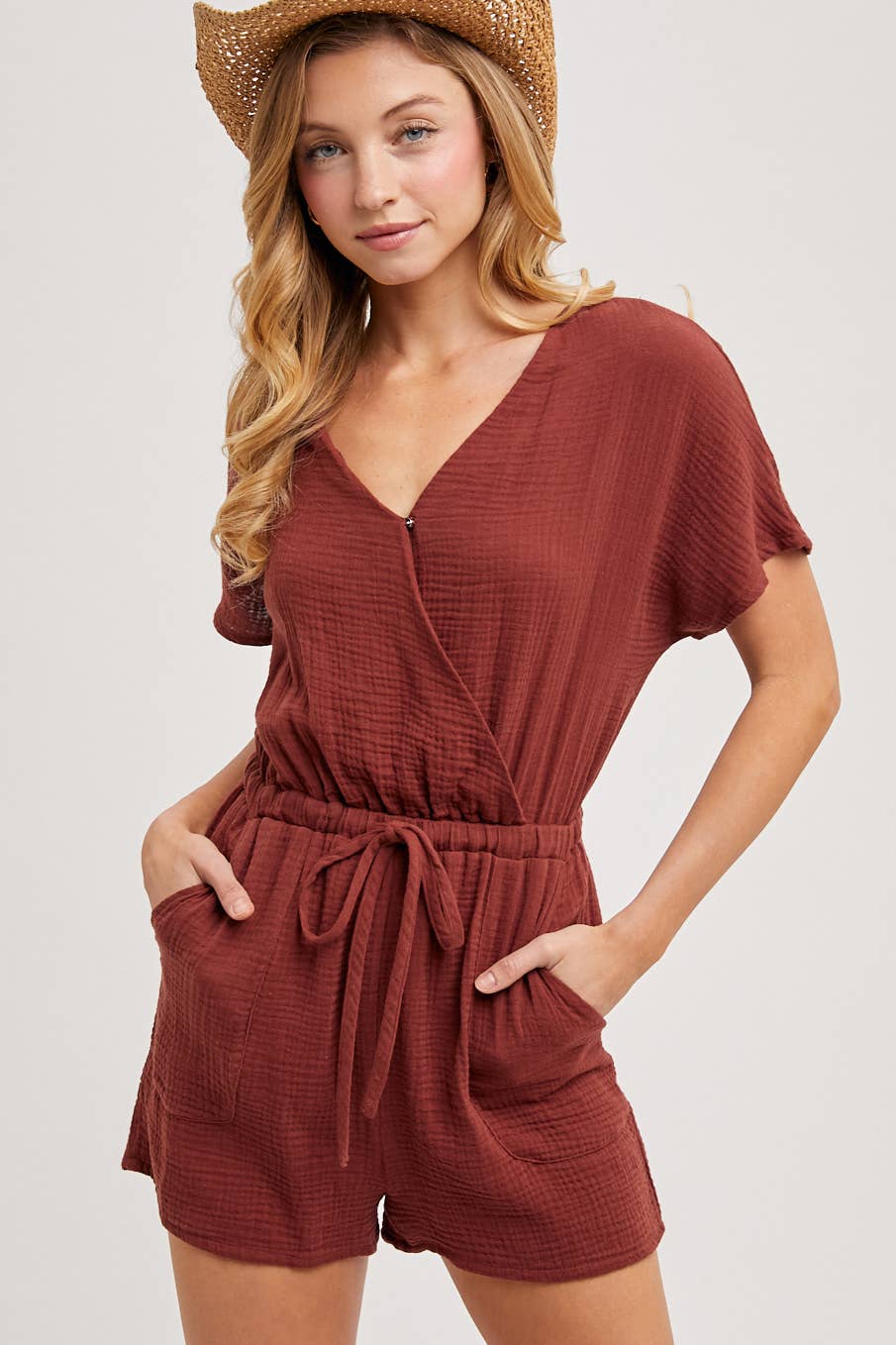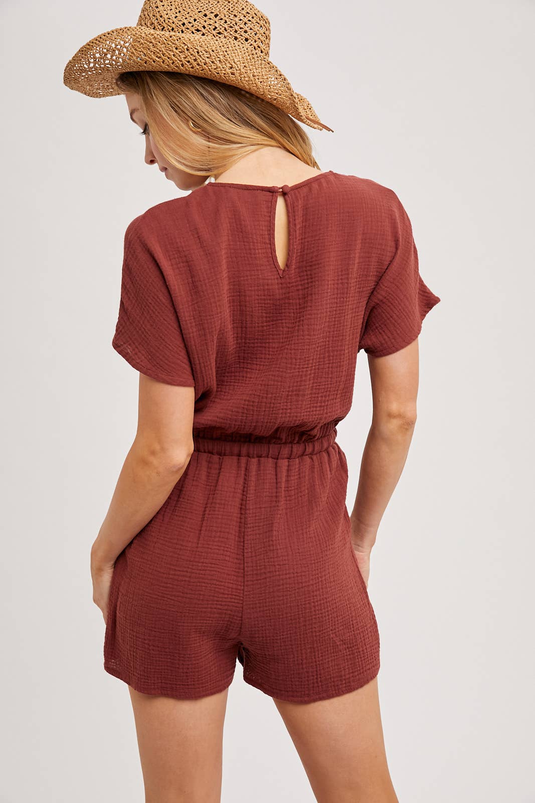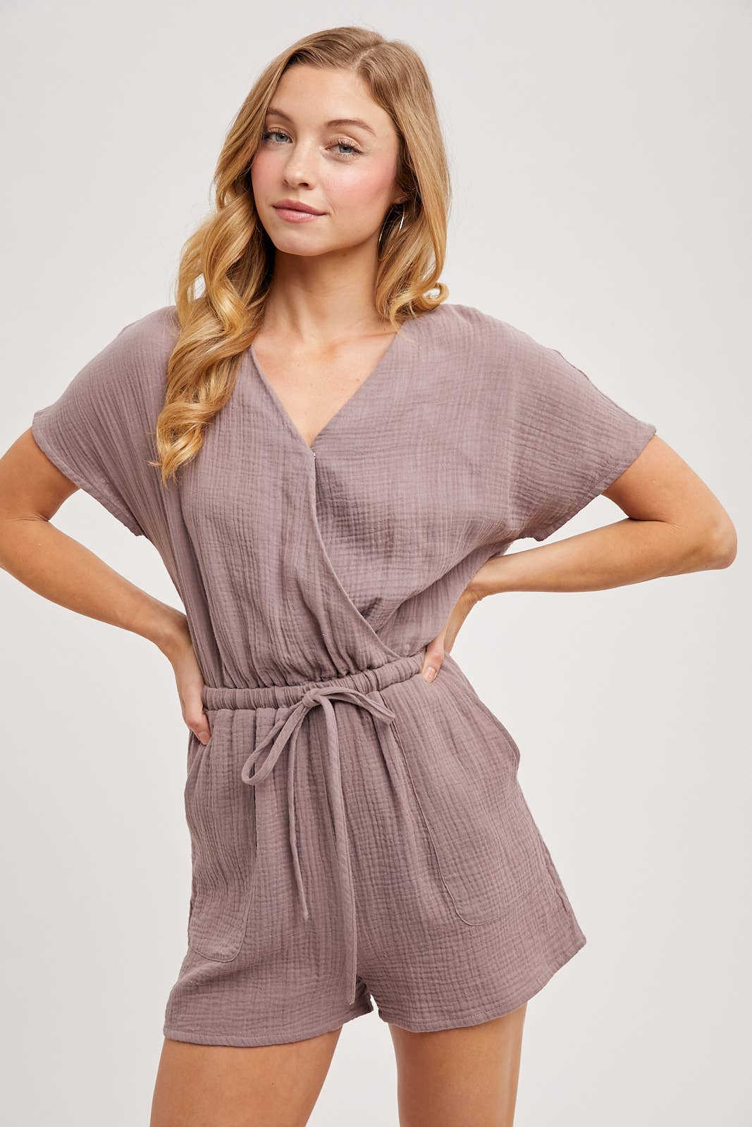 The Wrap Waist Drawstring Romper with Short Sleeves and Side Pockets is a versatile and chic one-piece outfit. Featuring a wrap-style design at the waist, this romper adds a touch of sophistication to your look. The drawstring allows you to customize the fit to your liking, ensuring comfort and style. The short sleeves provide a relaxed and breezy feel, perfect for warm days or casual occasions. With convenient side pockets, this romper combines fashion with functionality. Whether you're dressing up for a day out or keeping it casual, this romper offers an effortlessly stylish and comfortable option for various occasions.